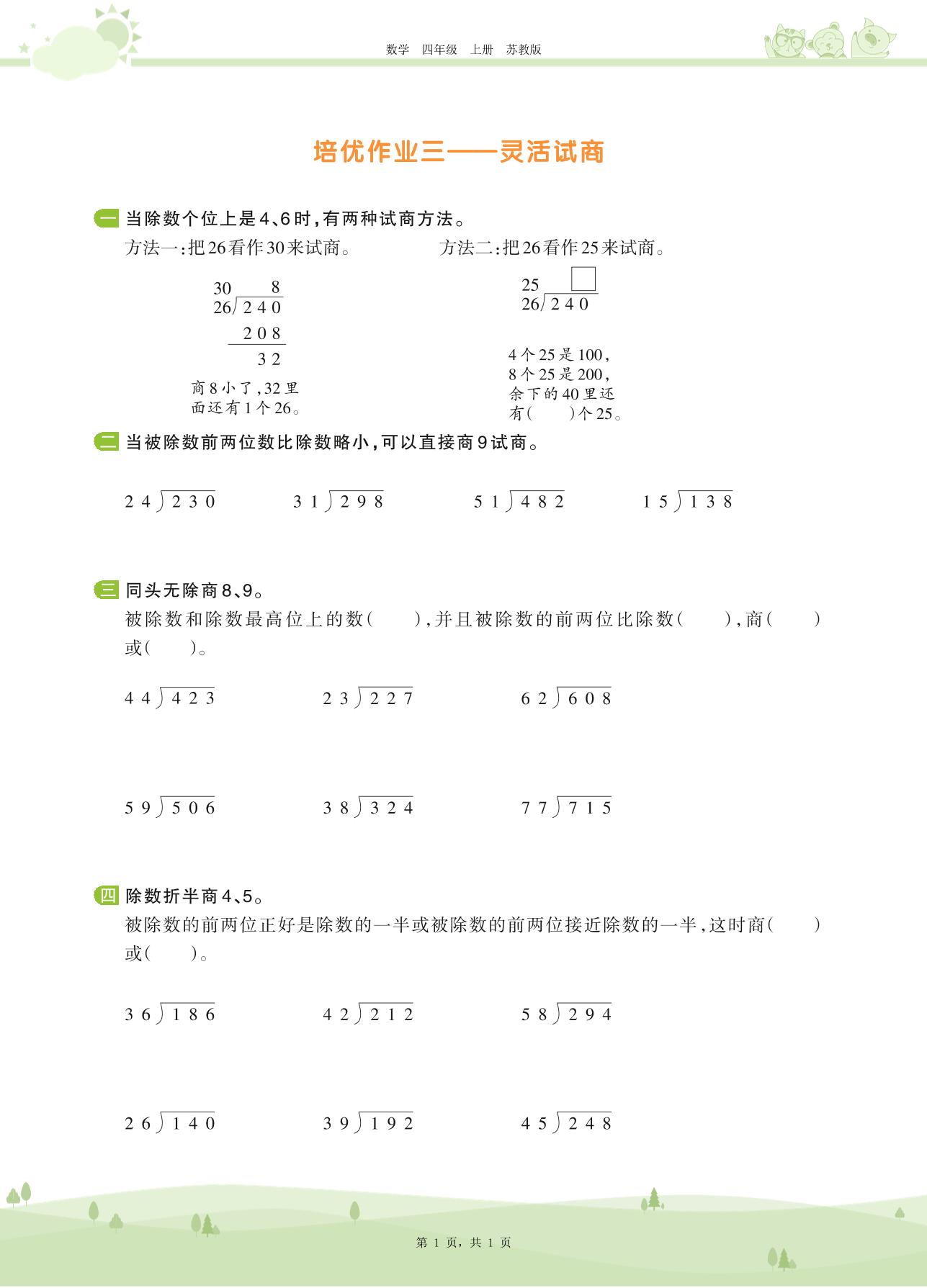 2020上册四年级数学苏教版 第二单元 两、三位数除以两位数——培优作业三——灵活试商