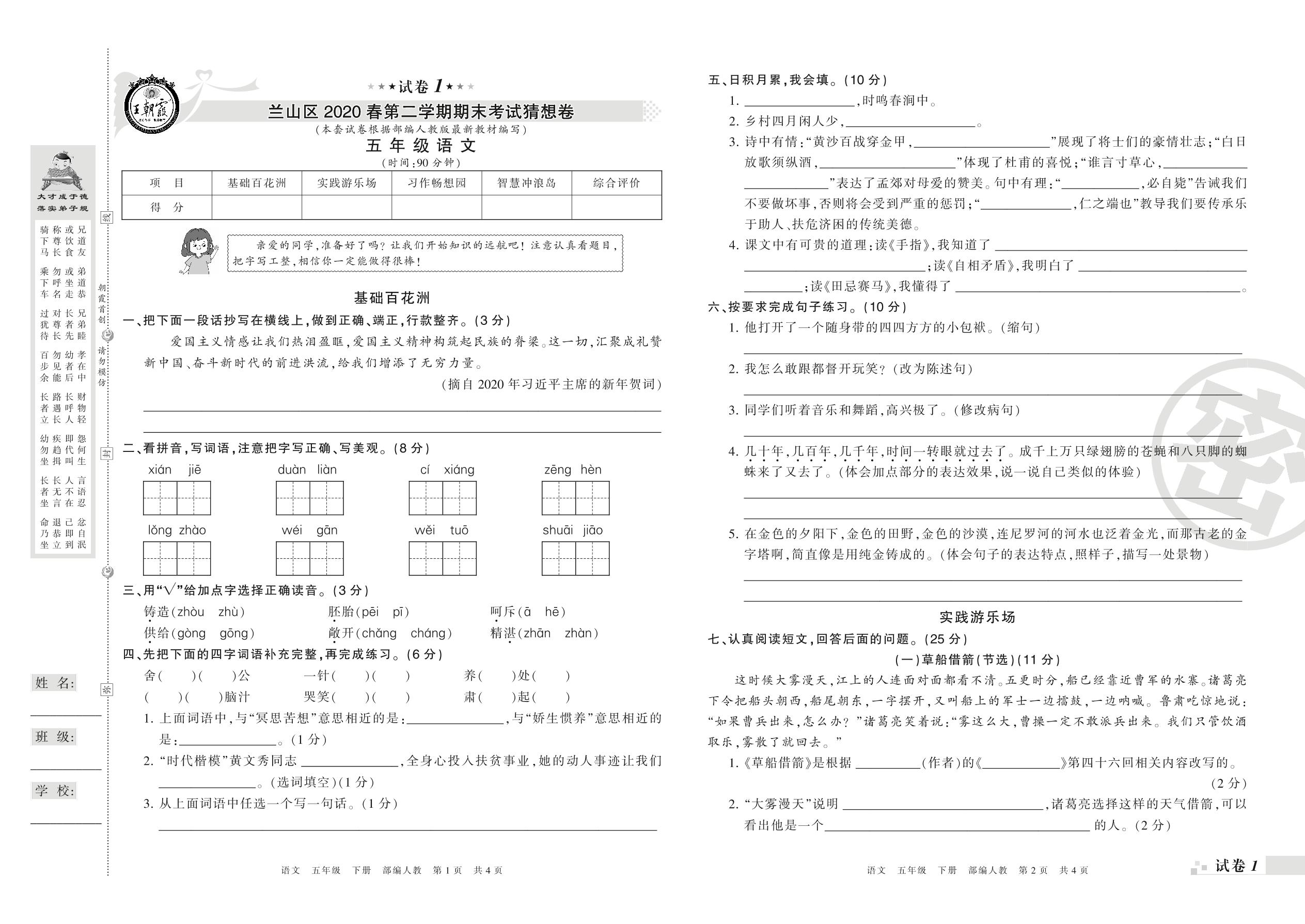 2018-2019学年第二学期临沂市兰山区猜想卷五年级语文试卷(人教版)【1】