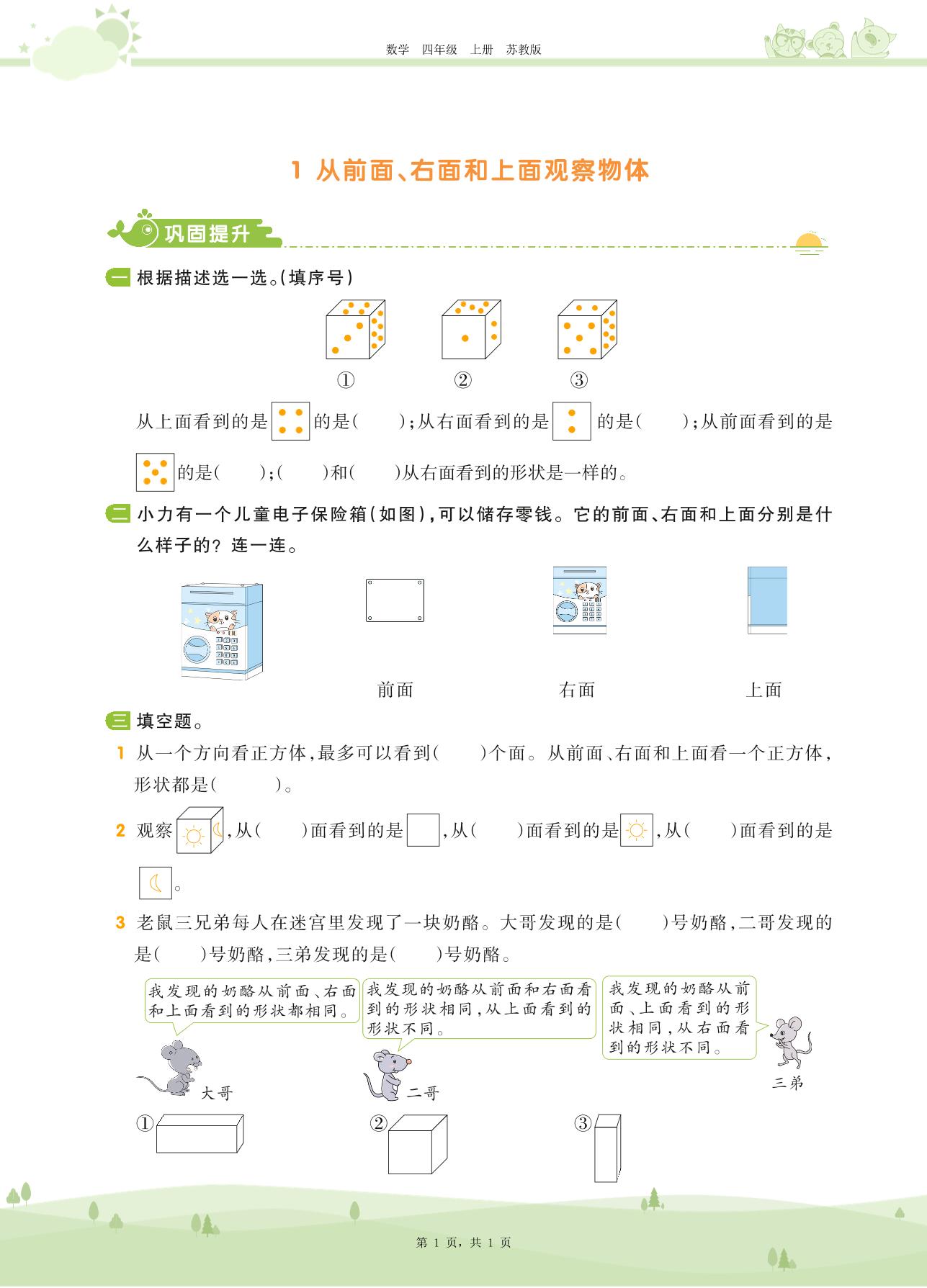 2020上册四年级数学苏教版 第三单元 观察物体——1 从前面、右面和上面观察物体