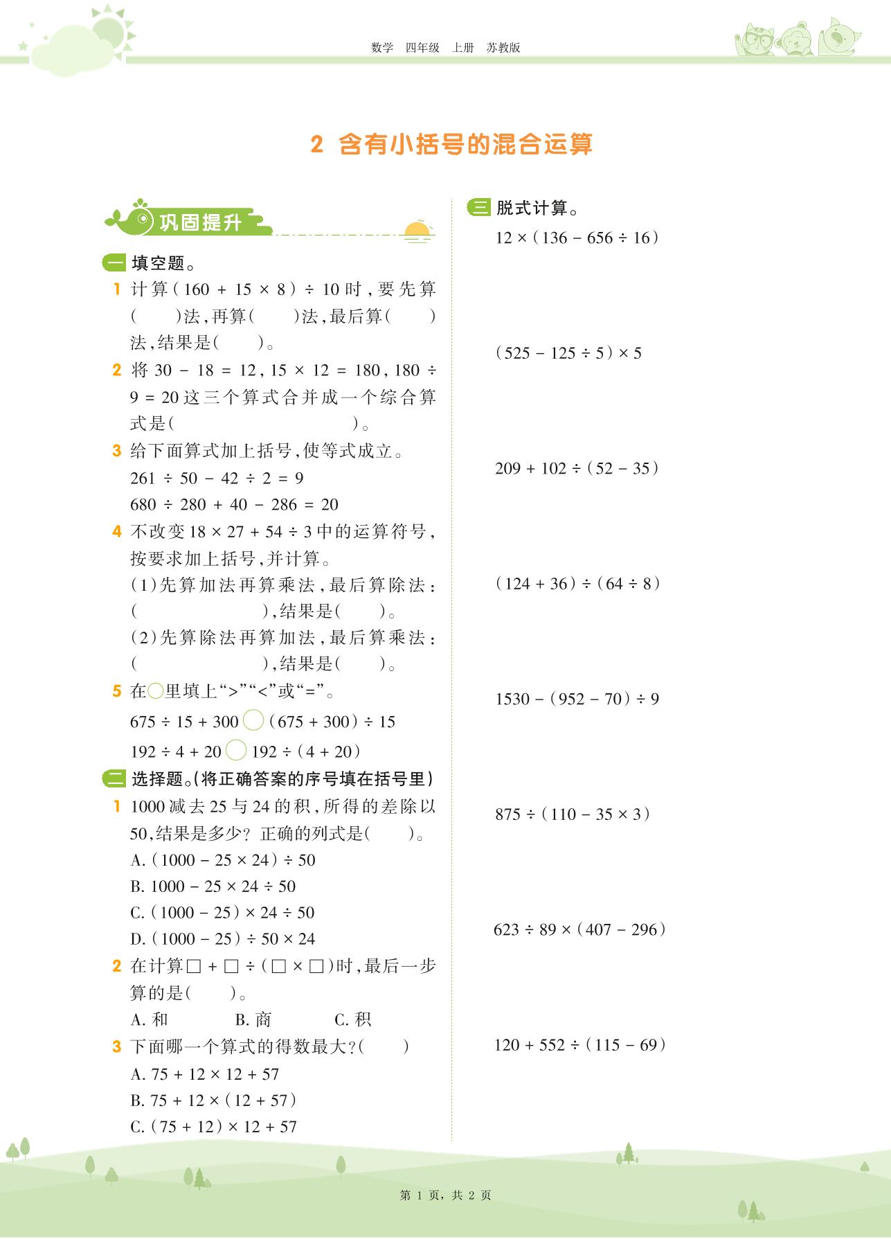 2020上册四年级数学苏教版 第七单元 整数四则混合运算——2 含有小括号的混合运算