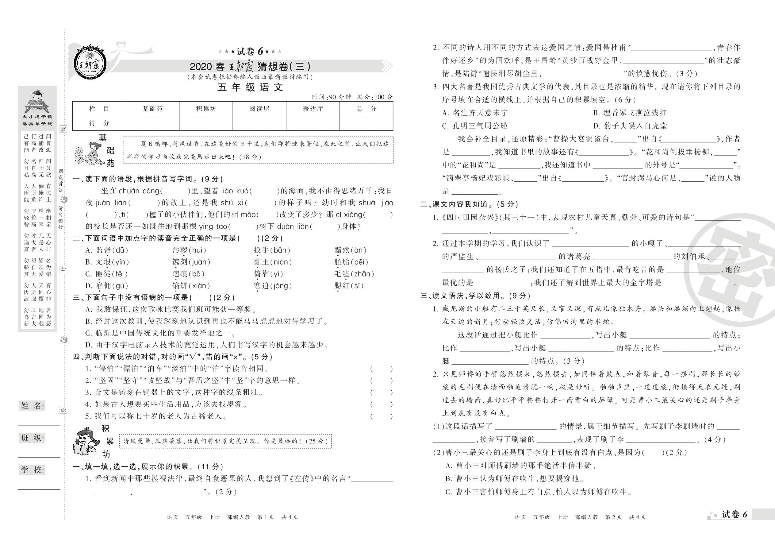 王朝霞期末猜想卷(三)五年级下册语文(人教版)【6】