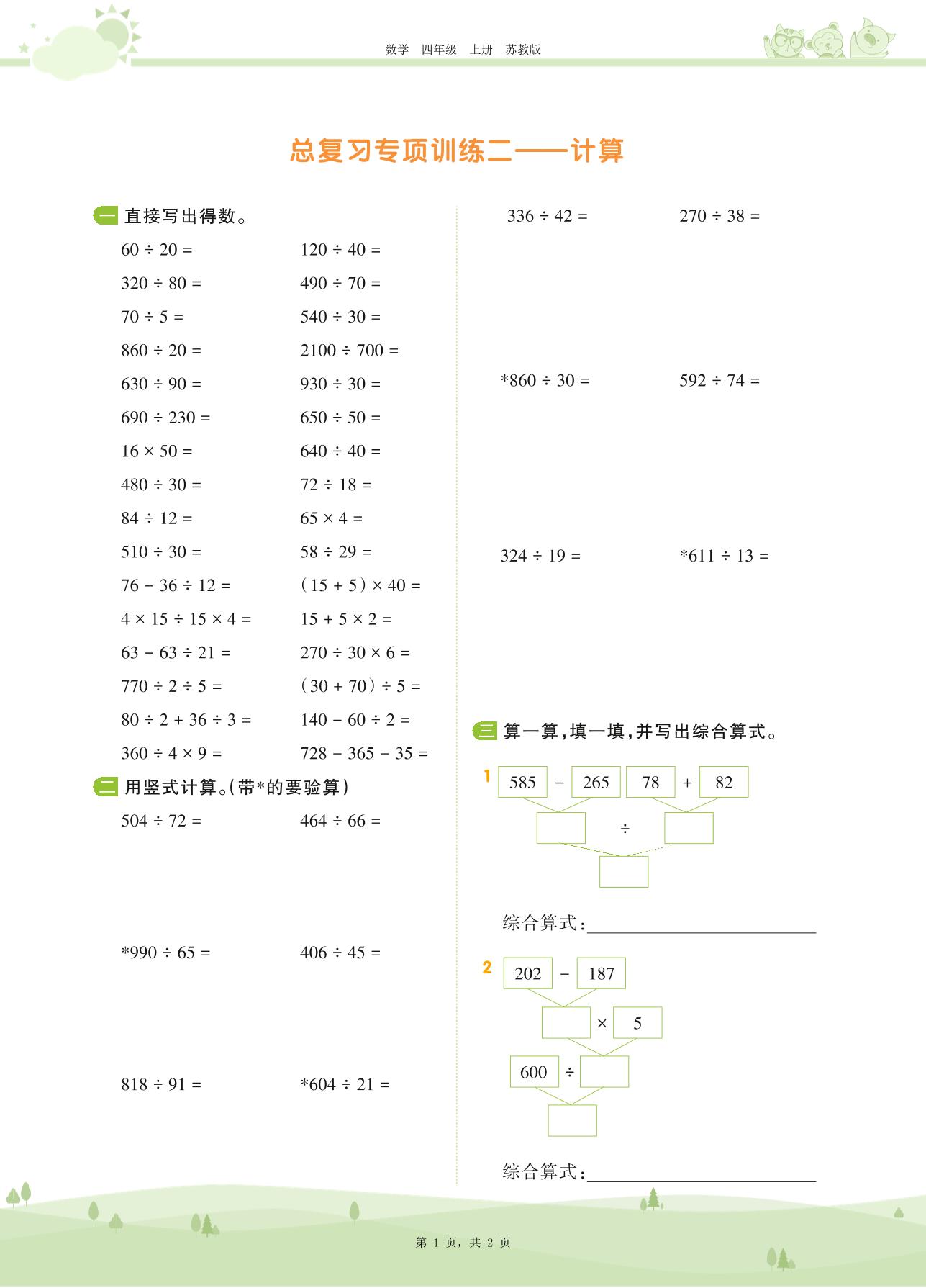 2020上册四年级数学苏教版 第九单元 整理与复习——计算