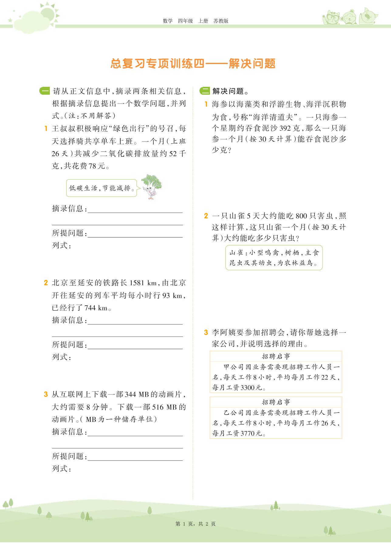 2020上册四年级数学苏教版 第九单元 整理与复习——解决问题