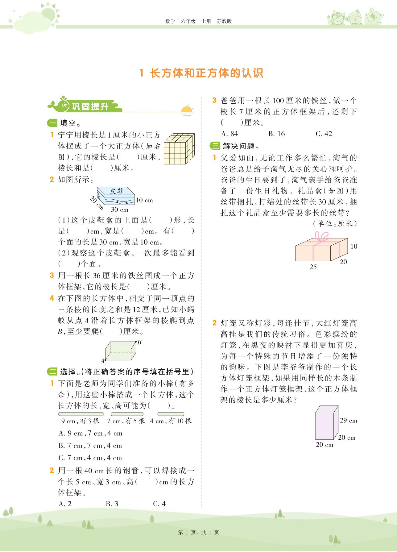 2020上册六年级数学苏教版 第一单元——1 长方体和正方体的认识
