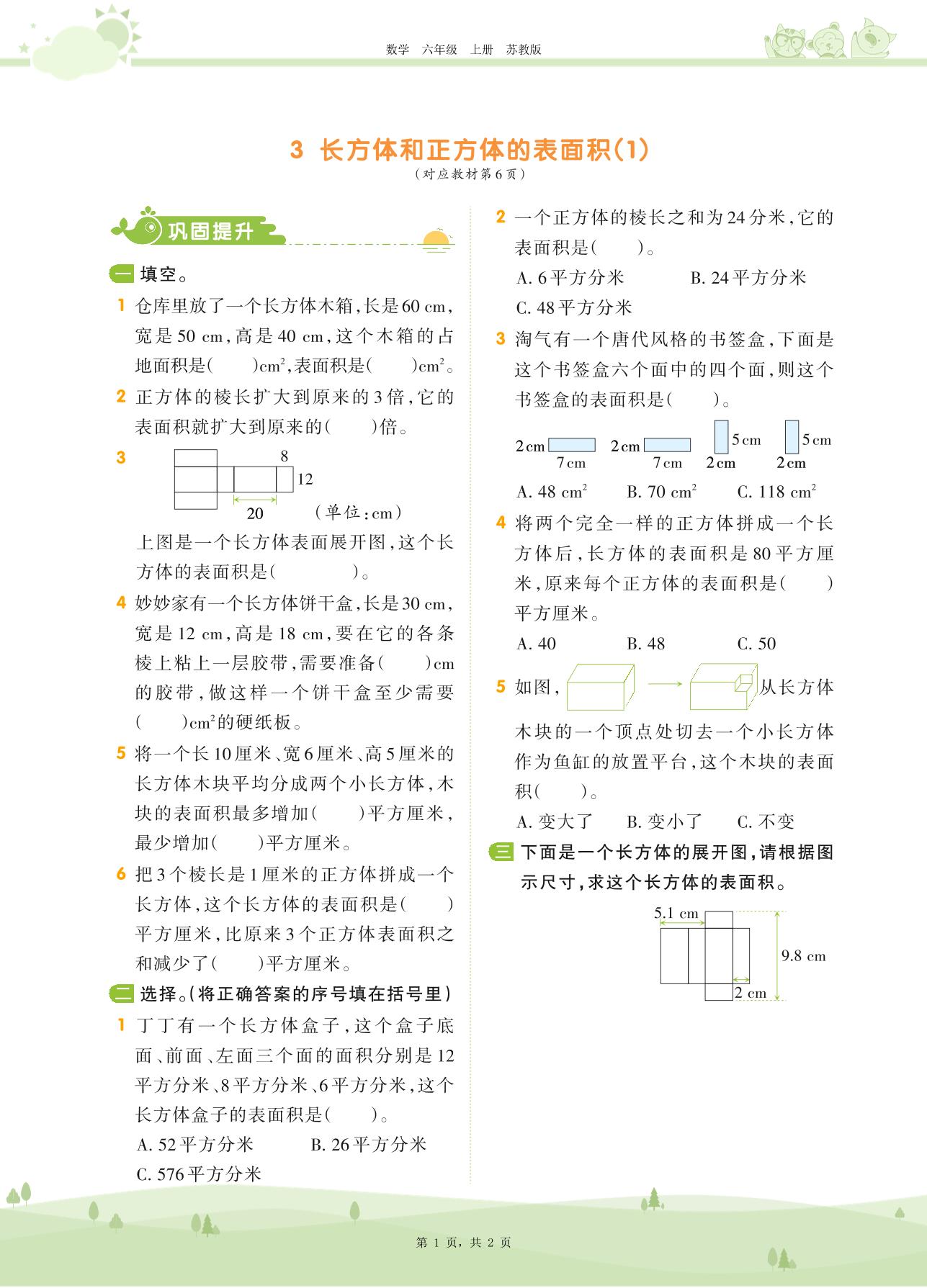 2020上册六年级数学苏教版 第一单元——3 长方体和正方体的表面积(1)