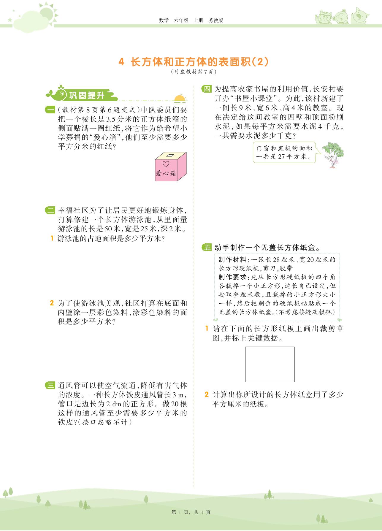 2020上册六年级数学苏教版 第一单元——4 长方体和正方体的表面积(2)