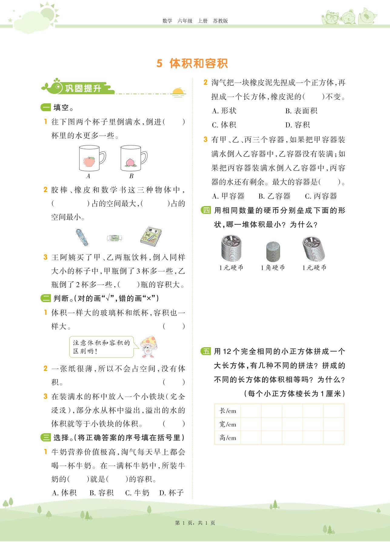 2020上册六年级数学苏教版 第一单元——5 体积和容积