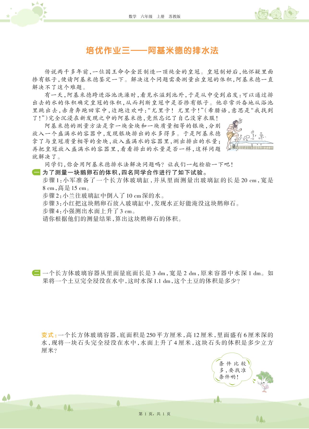 2020上册六年级数学苏教版 第一单元——培优作业三——阿基米德的排水法