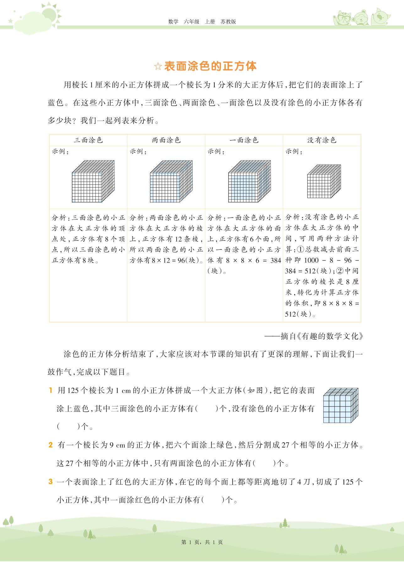 2020上册六年级数学苏教版 第一单元——表面涂色的正方体