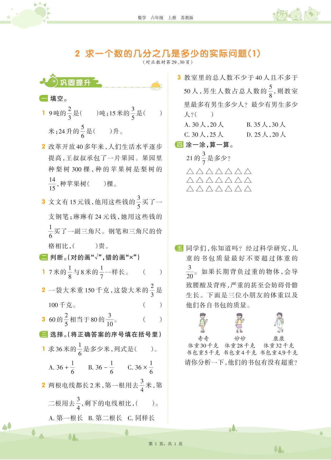 2020上册六年级数学苏教版 第二单元——2 求一个数的几分之几是多少的实际问题(1)