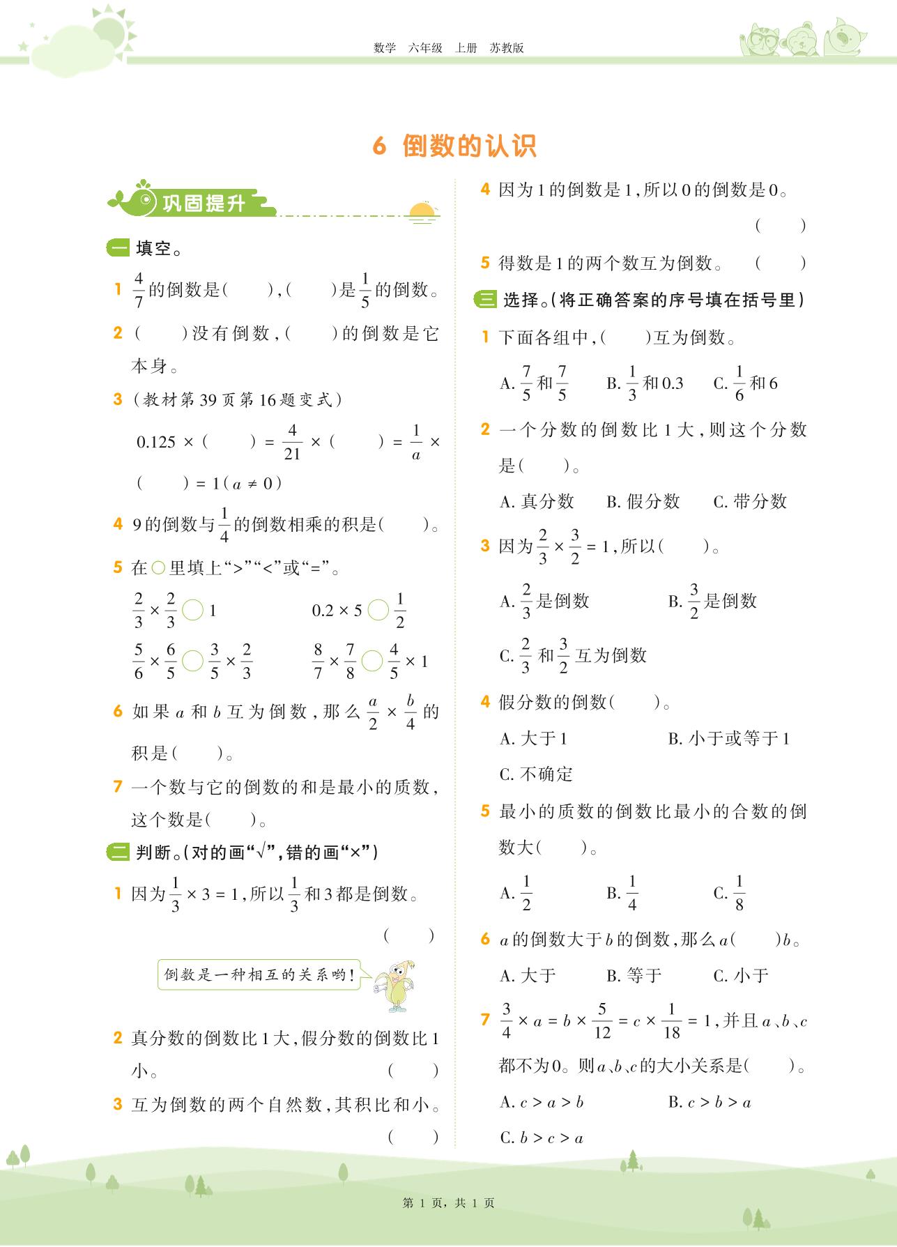 2020上册六年级数学苏教版 第二单元——6 倒数的认识