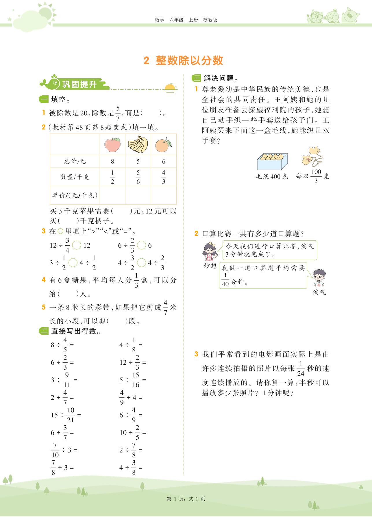 2020上册六年级数学苏教版 第三单元——2 整数除以分数