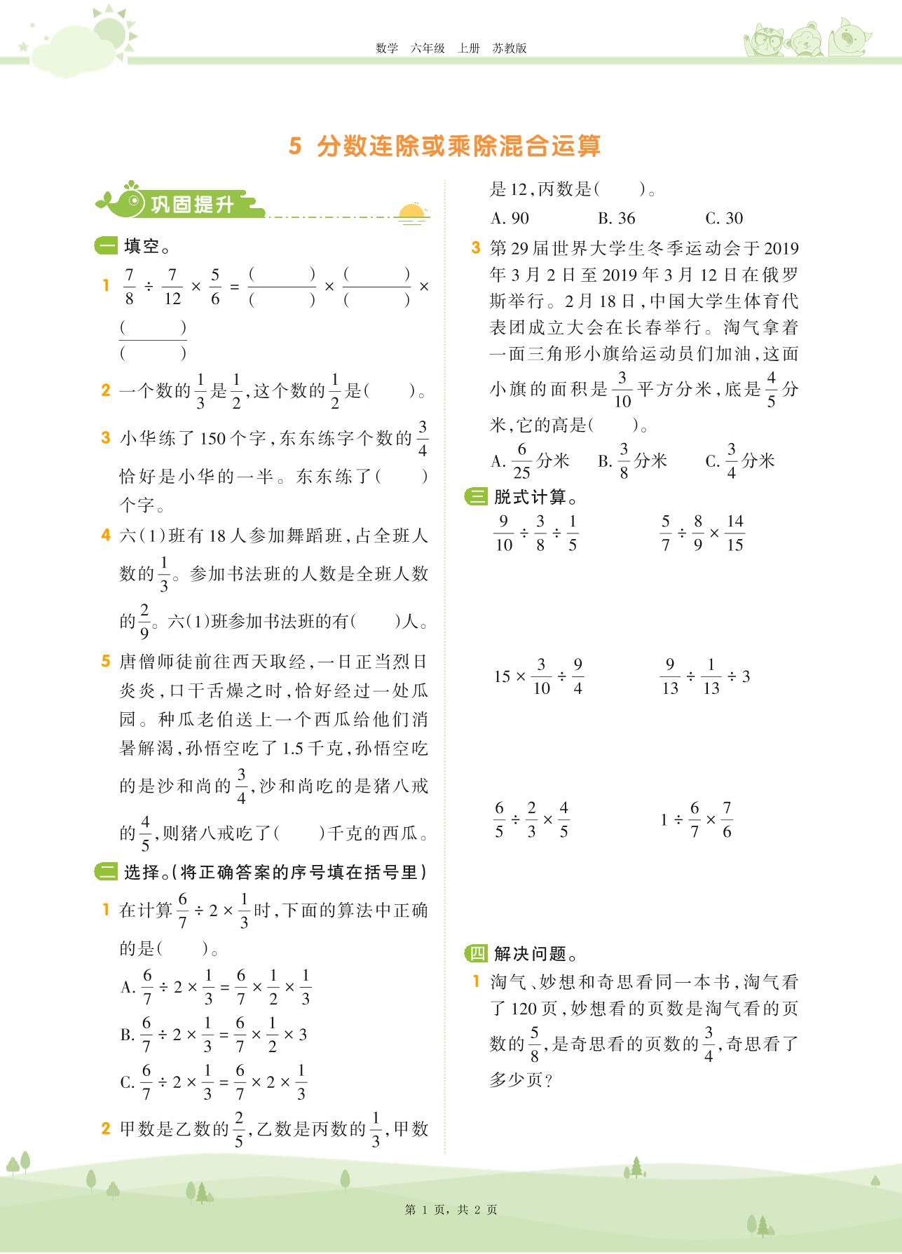 2020上册六年级数学苏教版 第三单元——5 分数连除或乘除混合运算