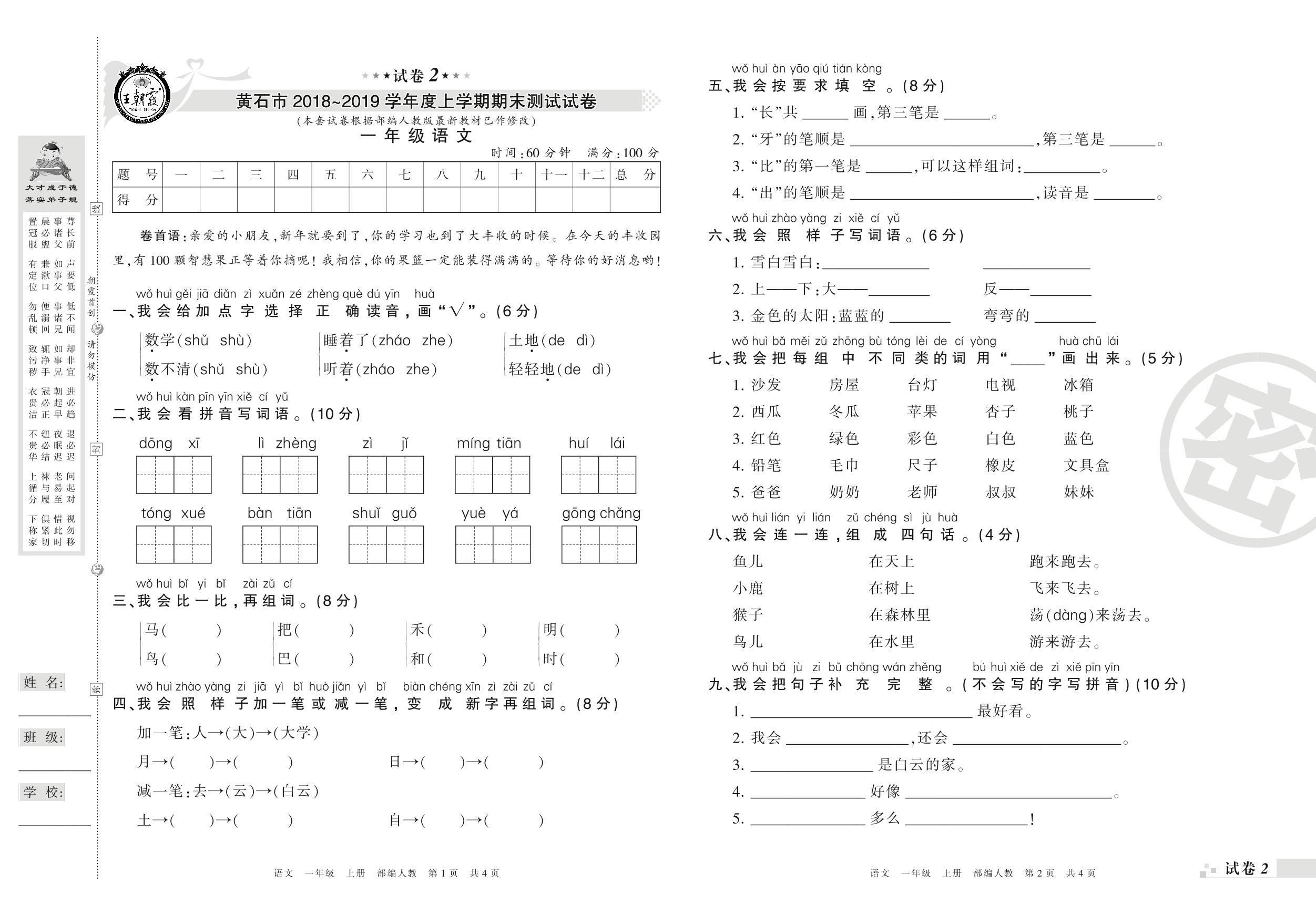 2018-2019学年第一学期黄石市一年级语文试卷(人教版)【2】