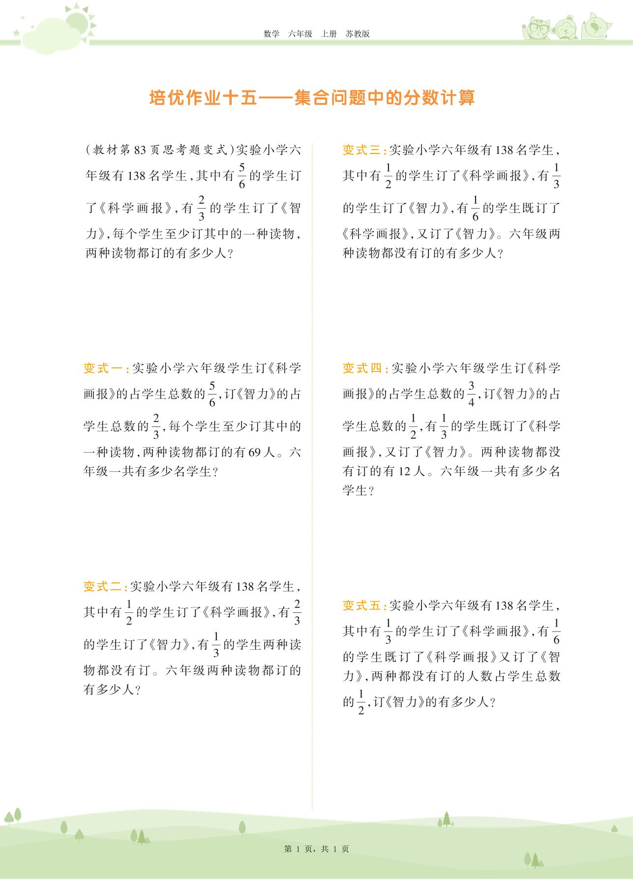 2020上册六年级数学苏教版 第五单元——培优作业十五——集合问题中的分数计算