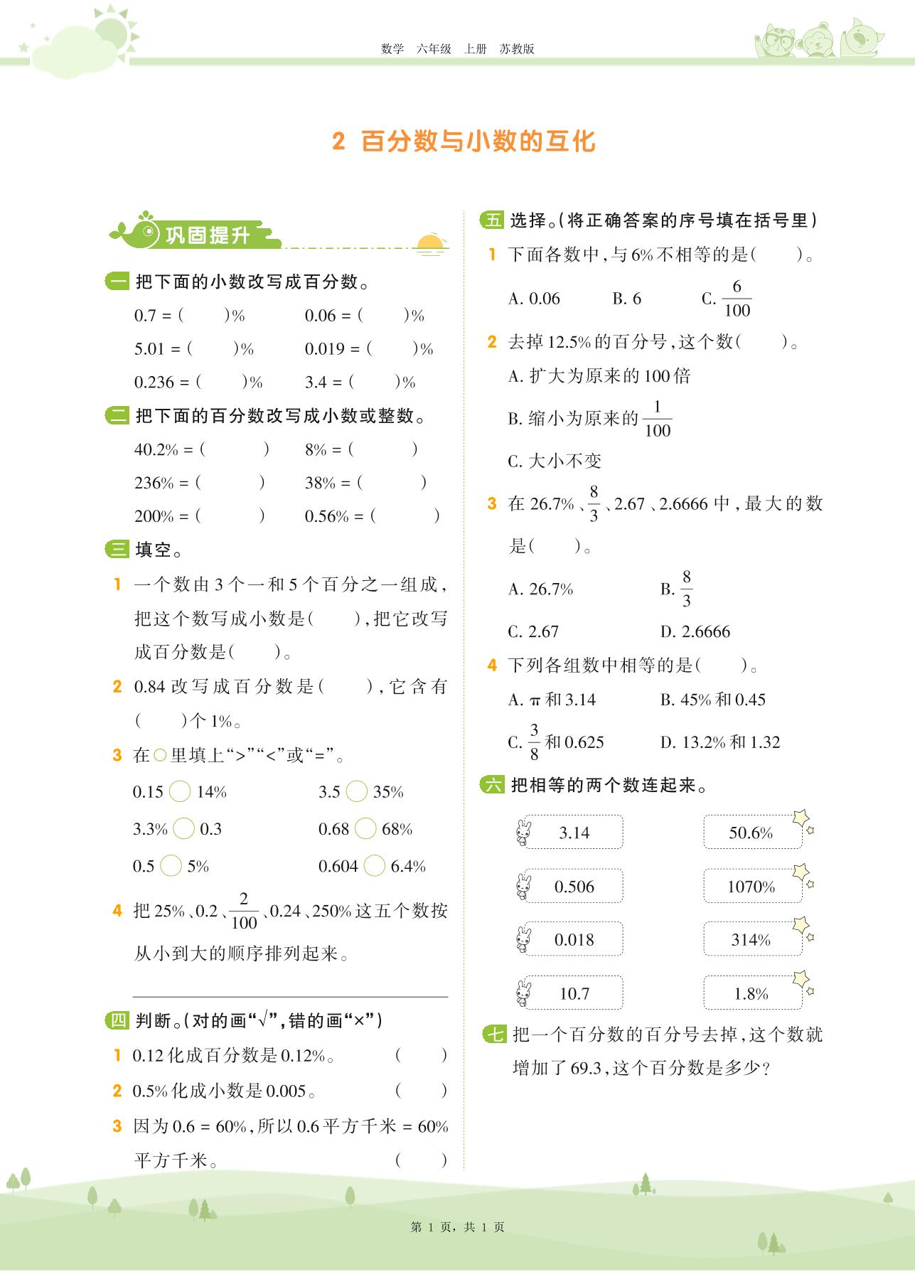 2020上册六年级数学苏教版 第六单元——2 百分数与小数的互化