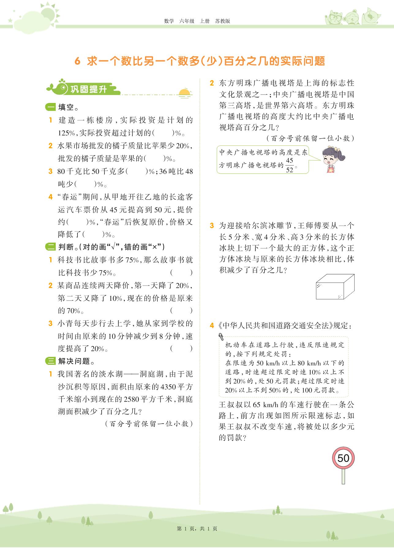 2020上册六年级数学苏教版 第六单元——6 求一个数比另一个数多(少)百分之几的实际问题
