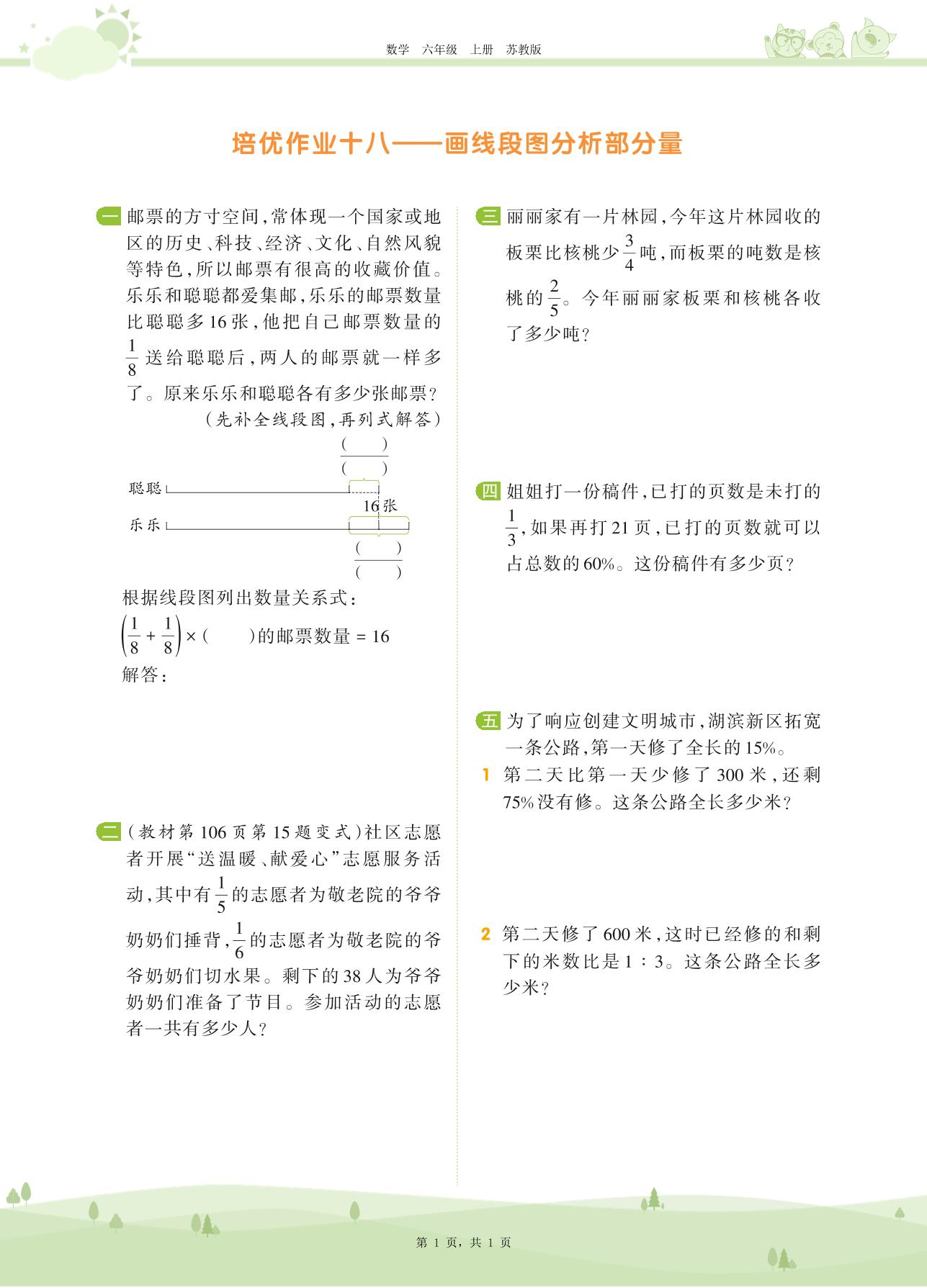 2020上册六年级数学苏教版 第六单元——培优作业十八——画线段图分析部分量