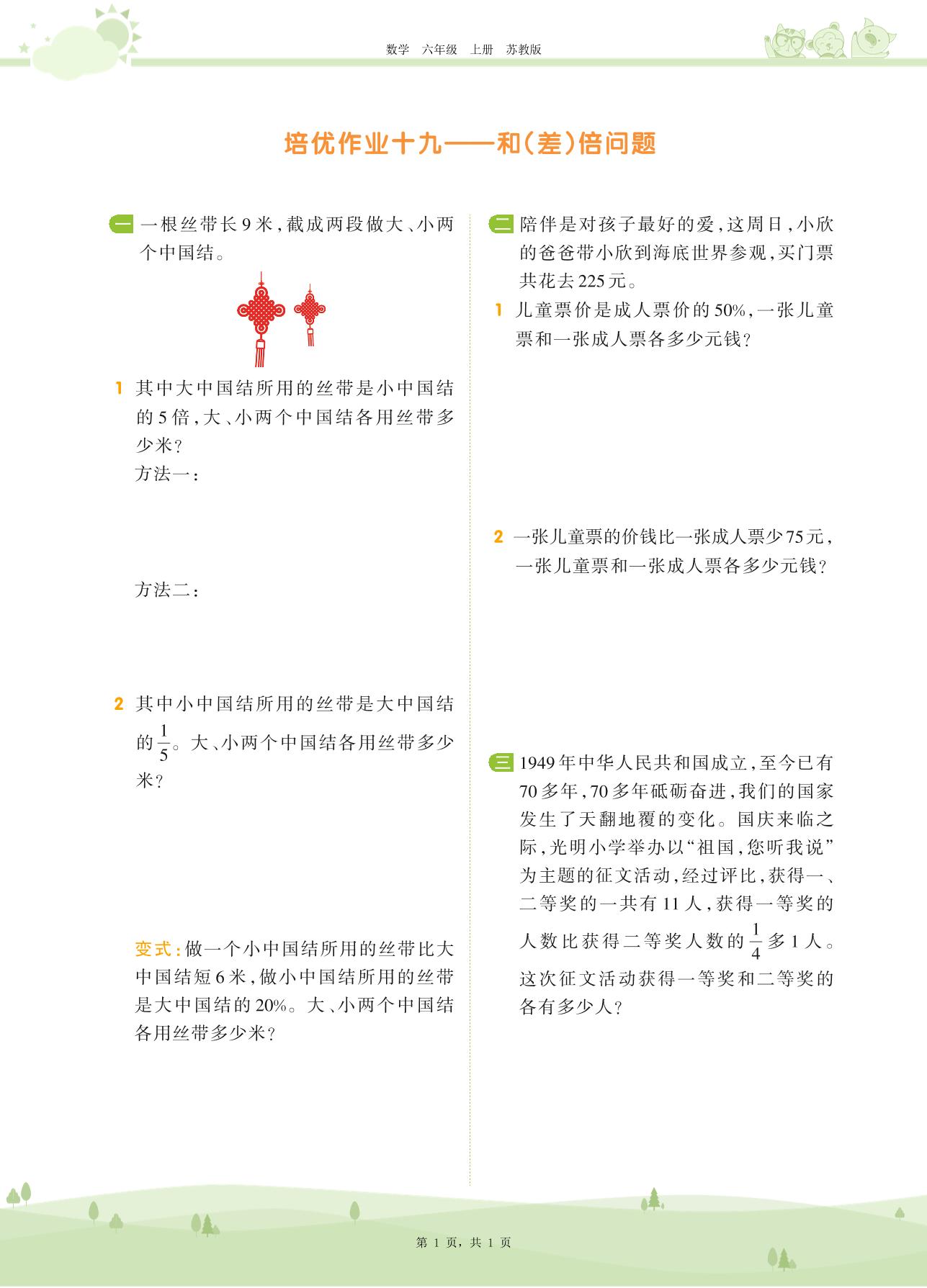 2020上册六年级数学苏教版 第六单元——培优作业十九——和(差)倍问题