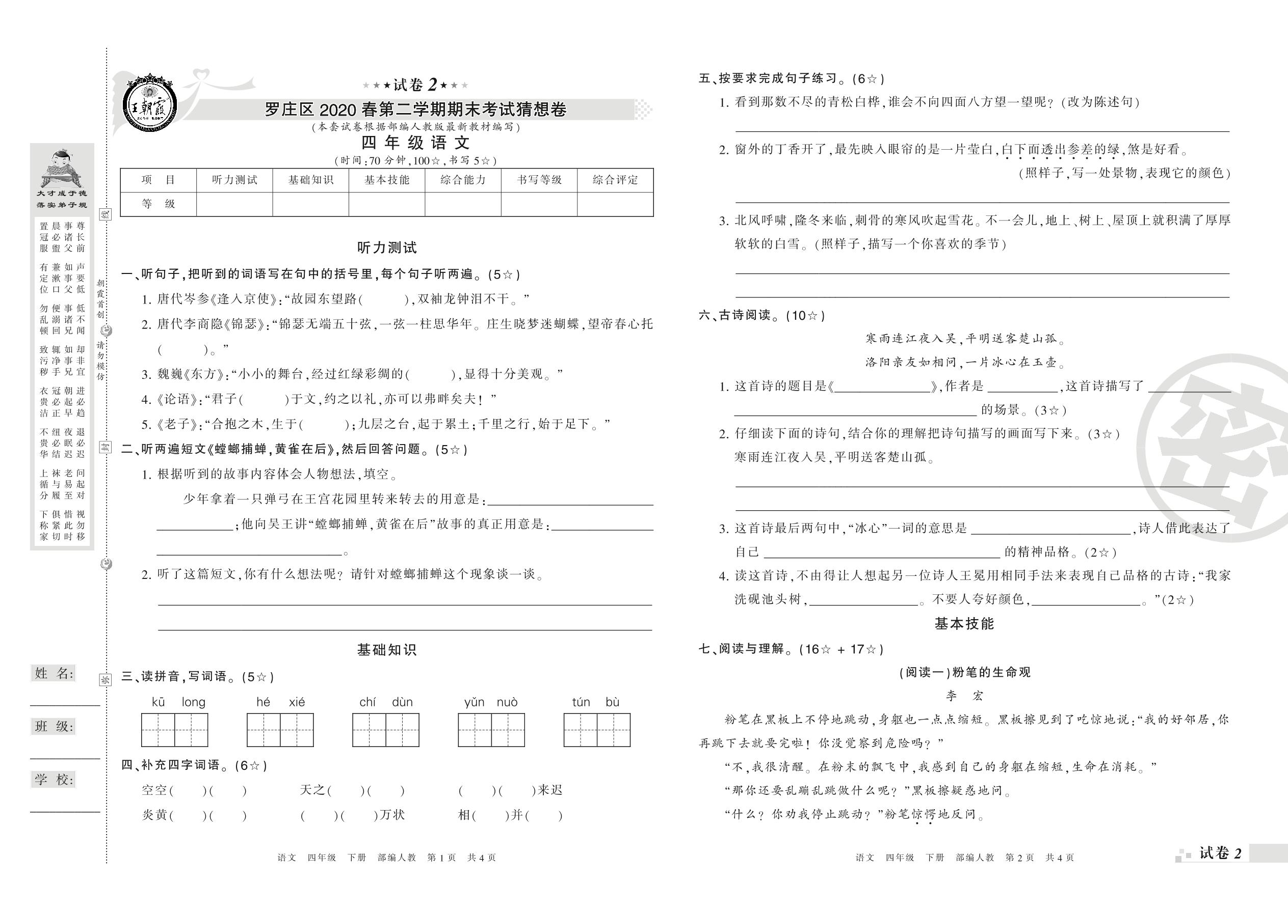2018-2019学年第二学期临沂市罗庄区猜想卷四年级语文试卷(人教版)【2】