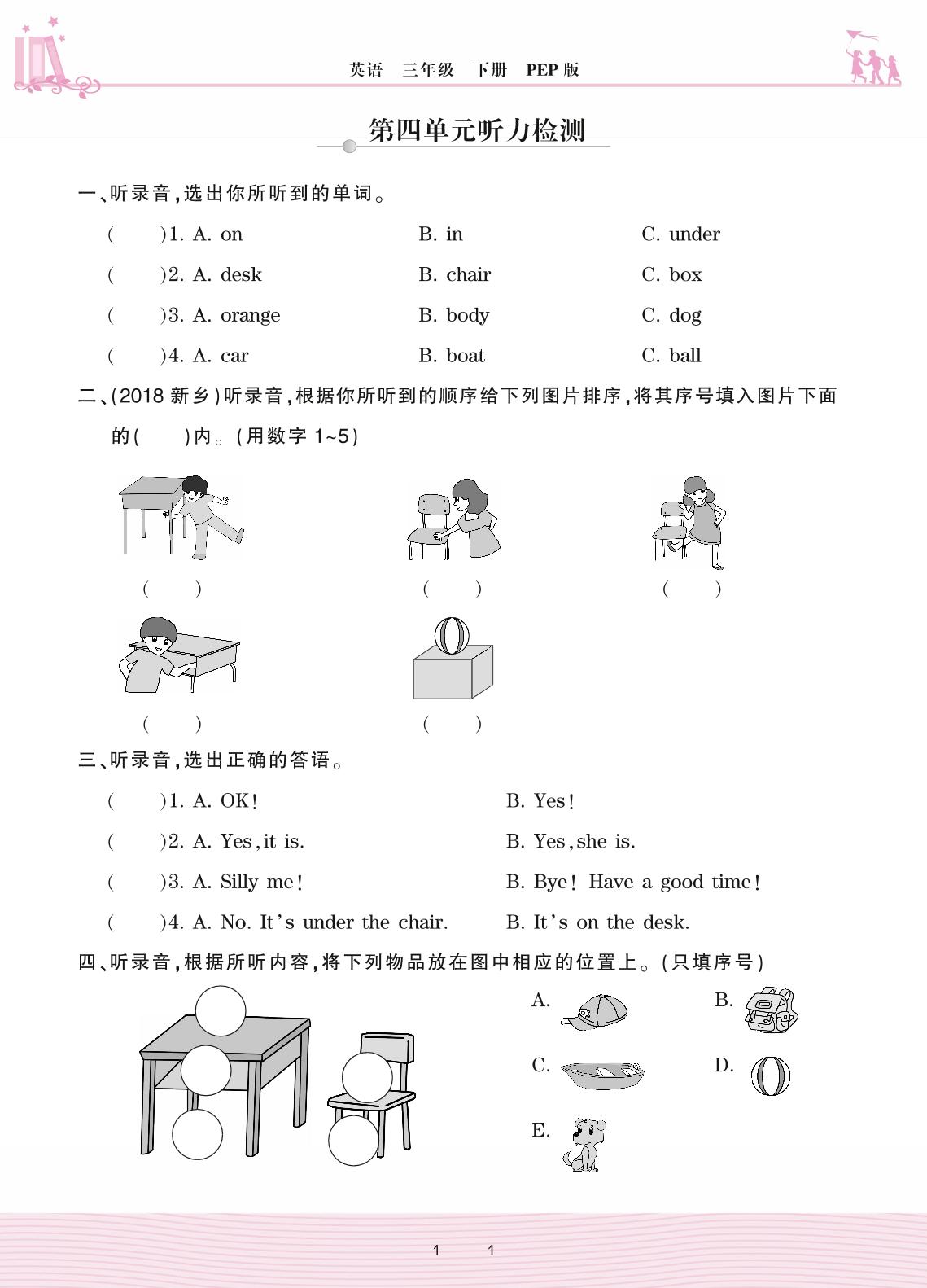 2021下册三年级英语PEP版 第四单元听力检测