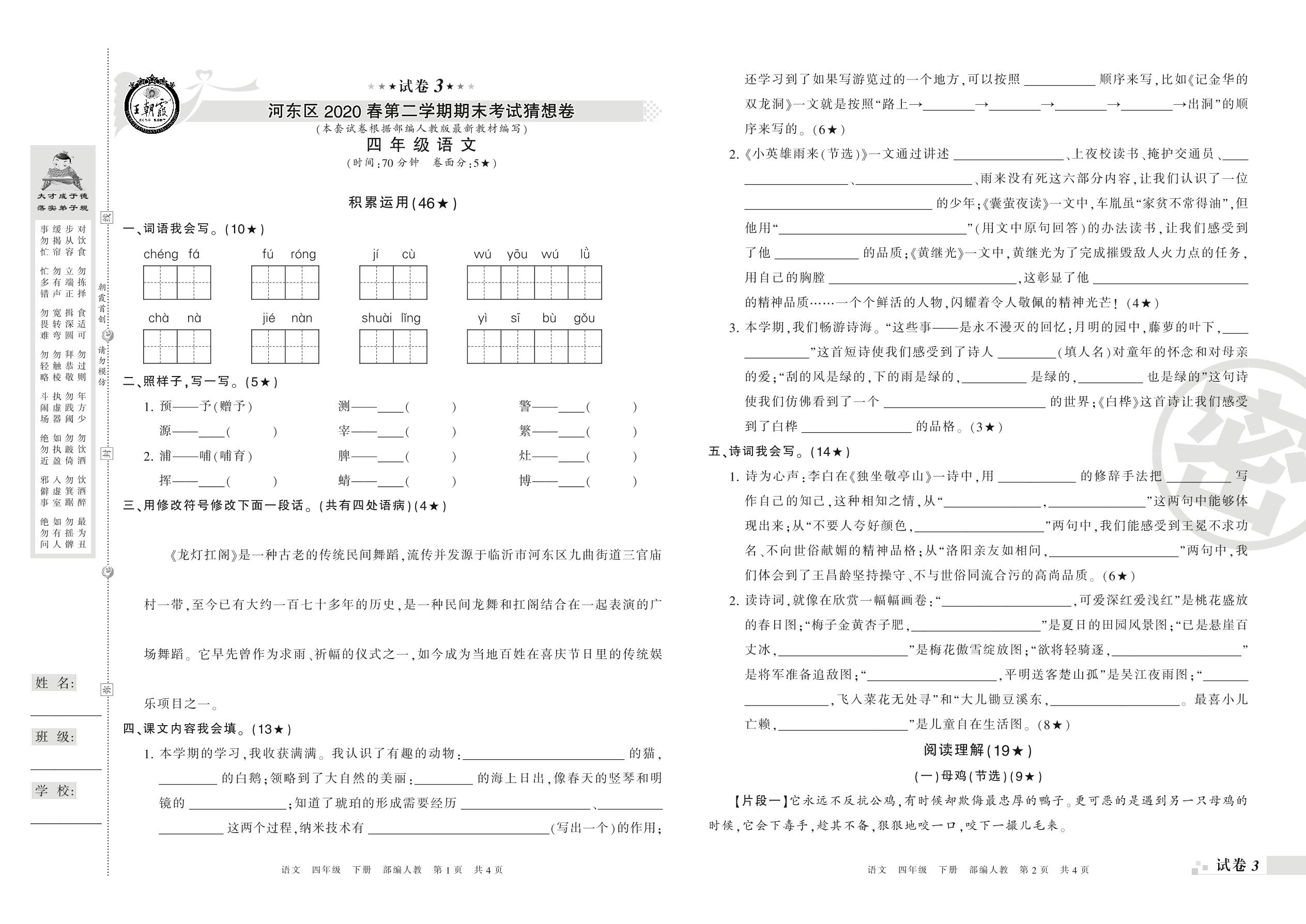 2018-2019学年第二学期临沂市河东区猜想卷四年级语文试卷(人教版)【3】