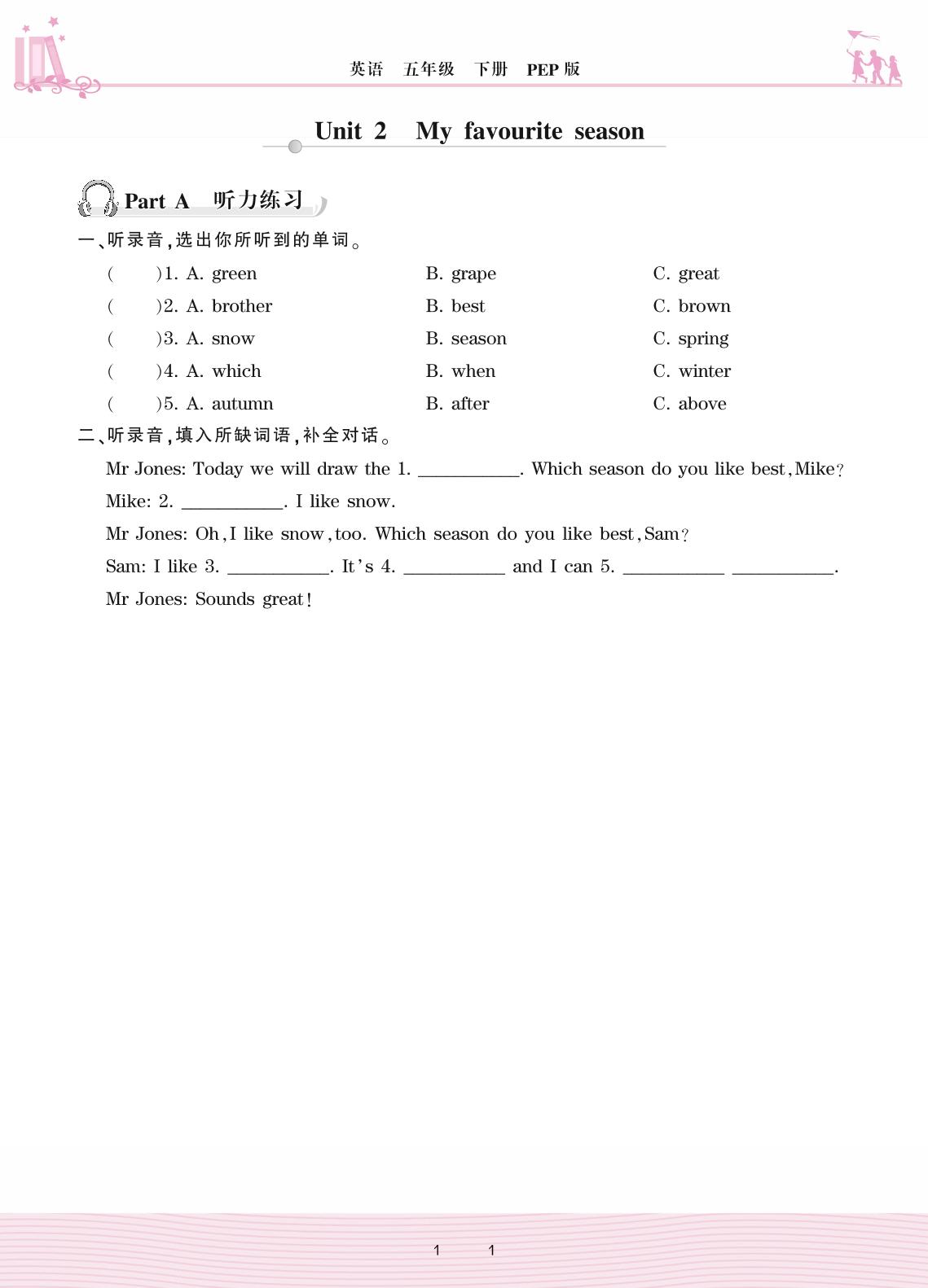 2021下册五年级英语PEP版 Unit 2 My favourite season—Part A 听力练习
