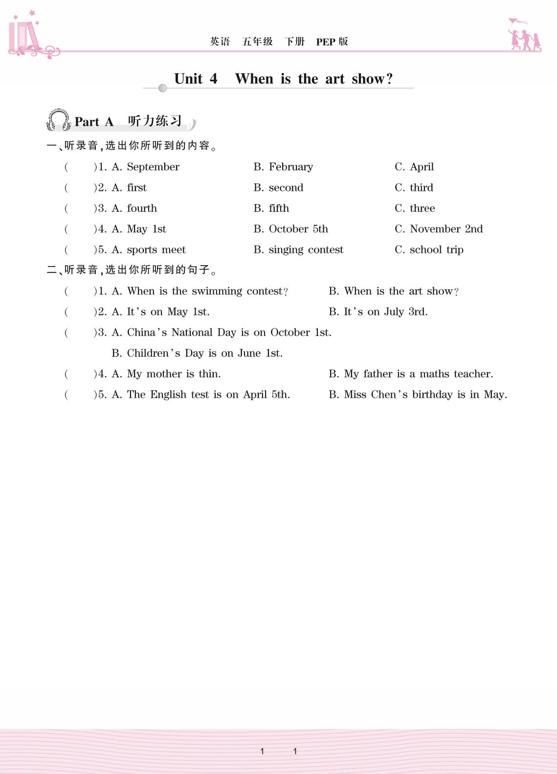 2021下册五年级英语PEP版 Unit 4 When is the art show?—Part A 听力练习