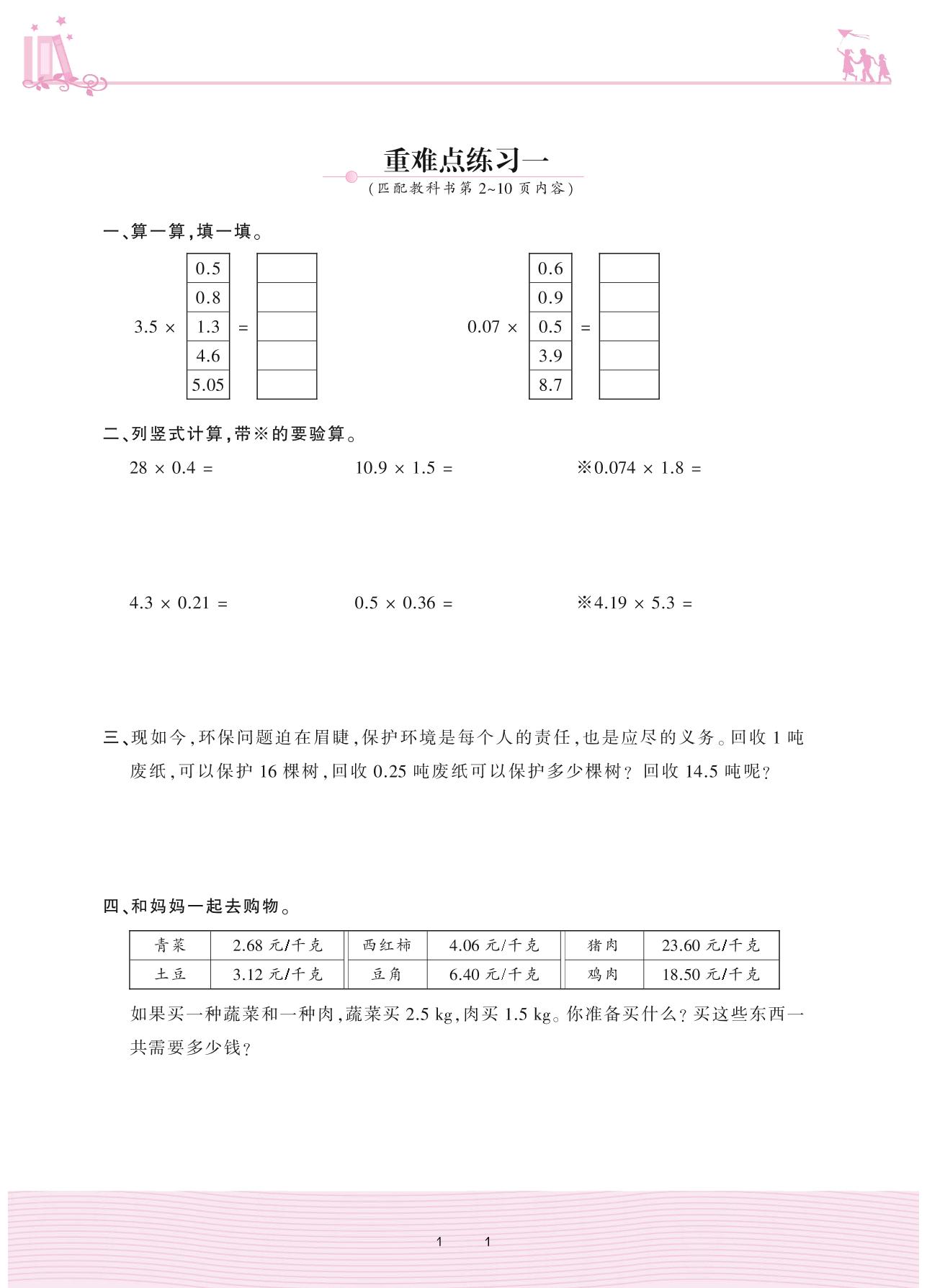 2020上册五年级数学人教版 1 小数乘法——重难点练习一