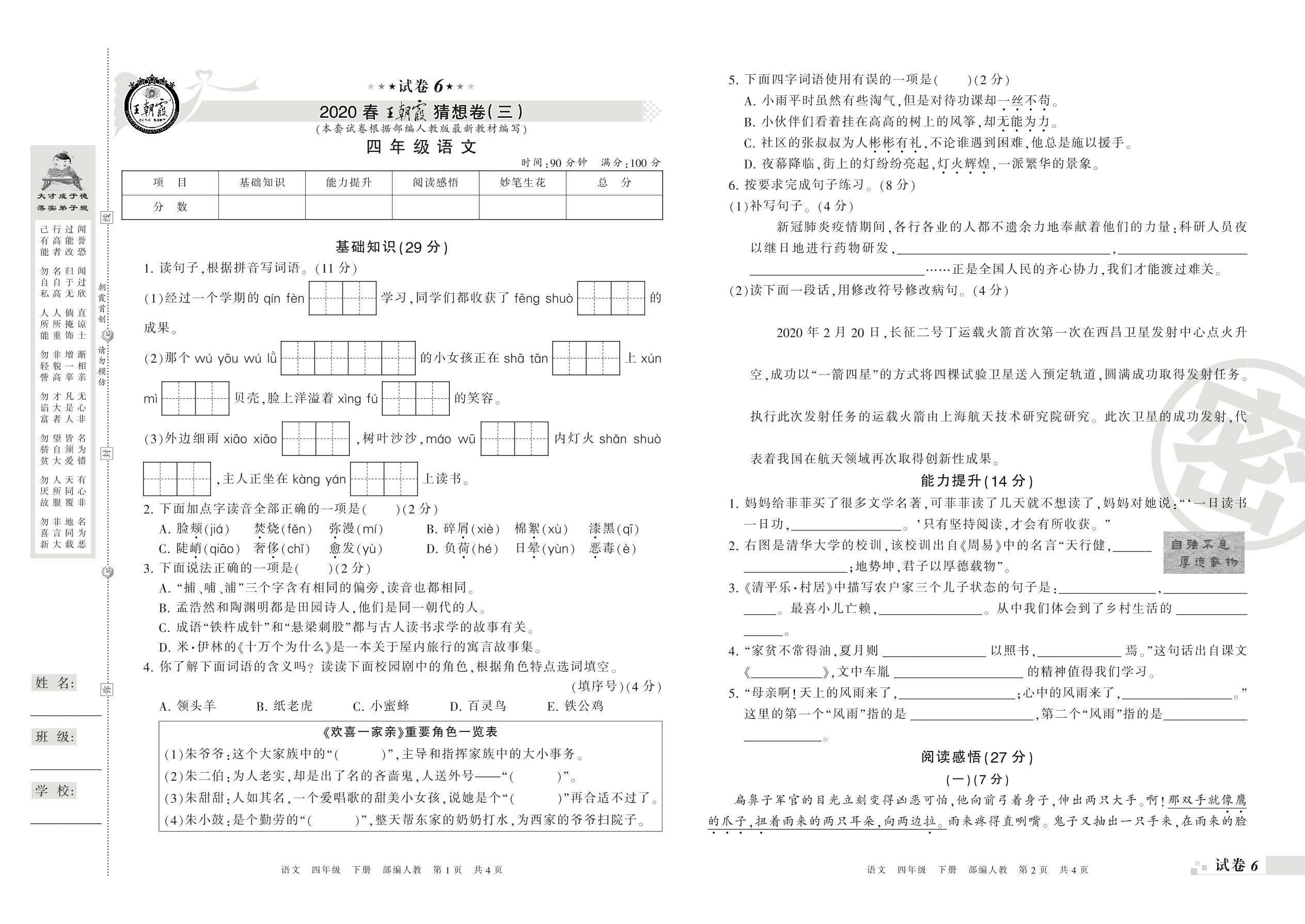 王朝霞期末猜想卷(三)四年级下册语文(人教版)【6】