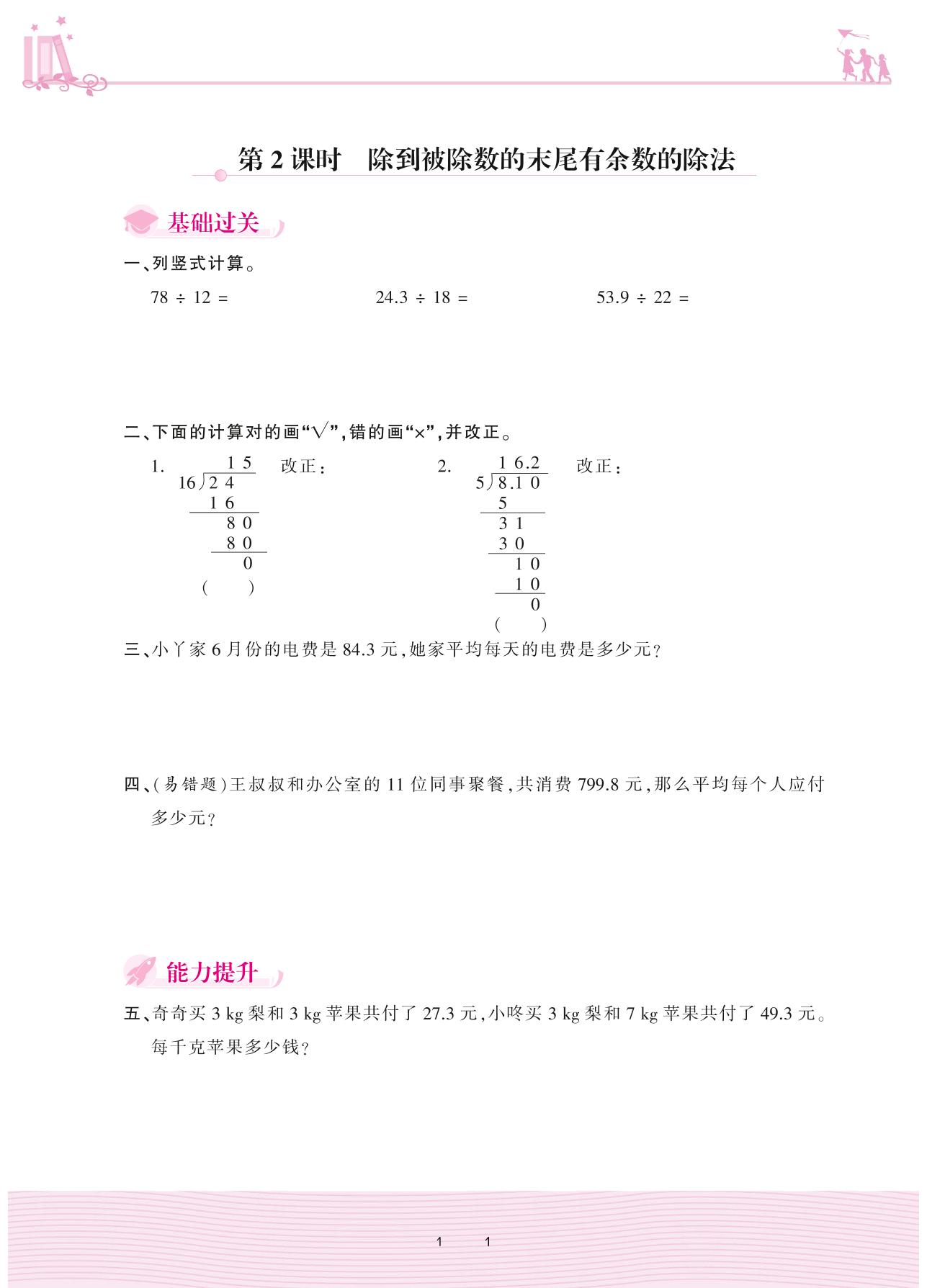 2020上册五年级数学人教版 3 小数除法 1. 除数是整数的小数除法——第2课时 除到被除数的末尾有余数的除法