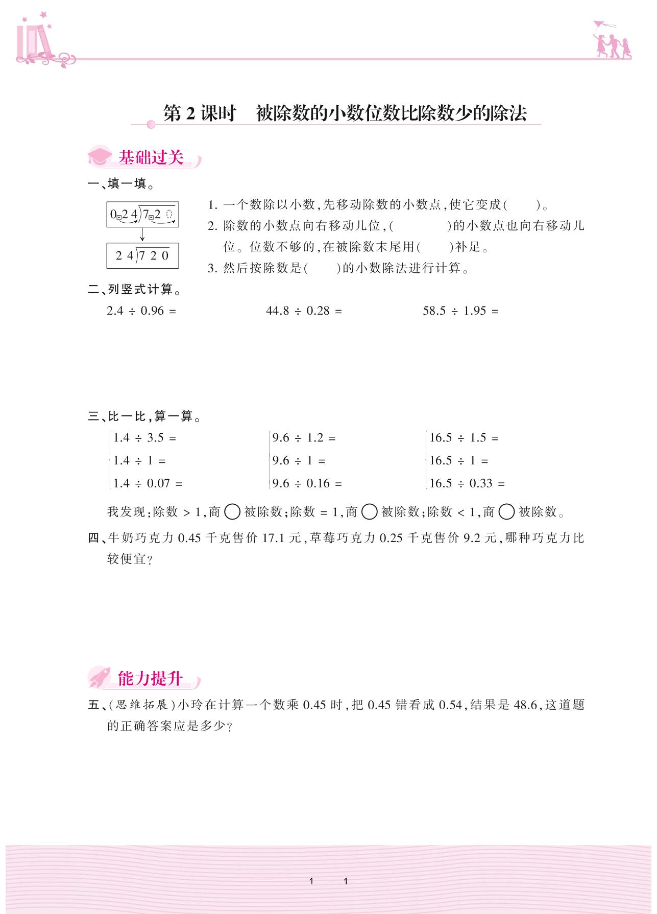 2020上册五年级数学人教版 3 小数除法 2. 一个数除以小数——第2课时 被除数的小数位数比除数少的除法
