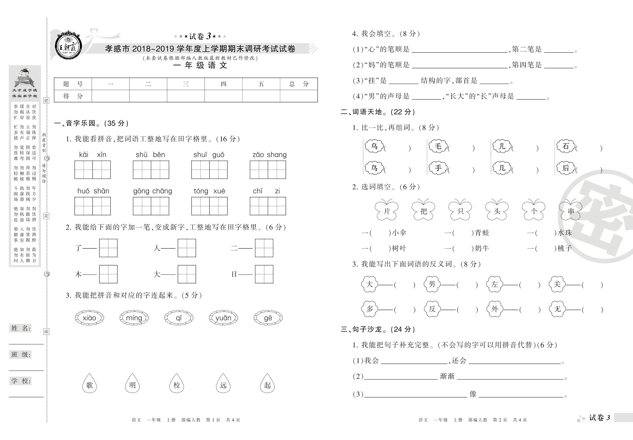 2018-2019学年第一学期孝感市一年级语文试卷(人教版)【3】
