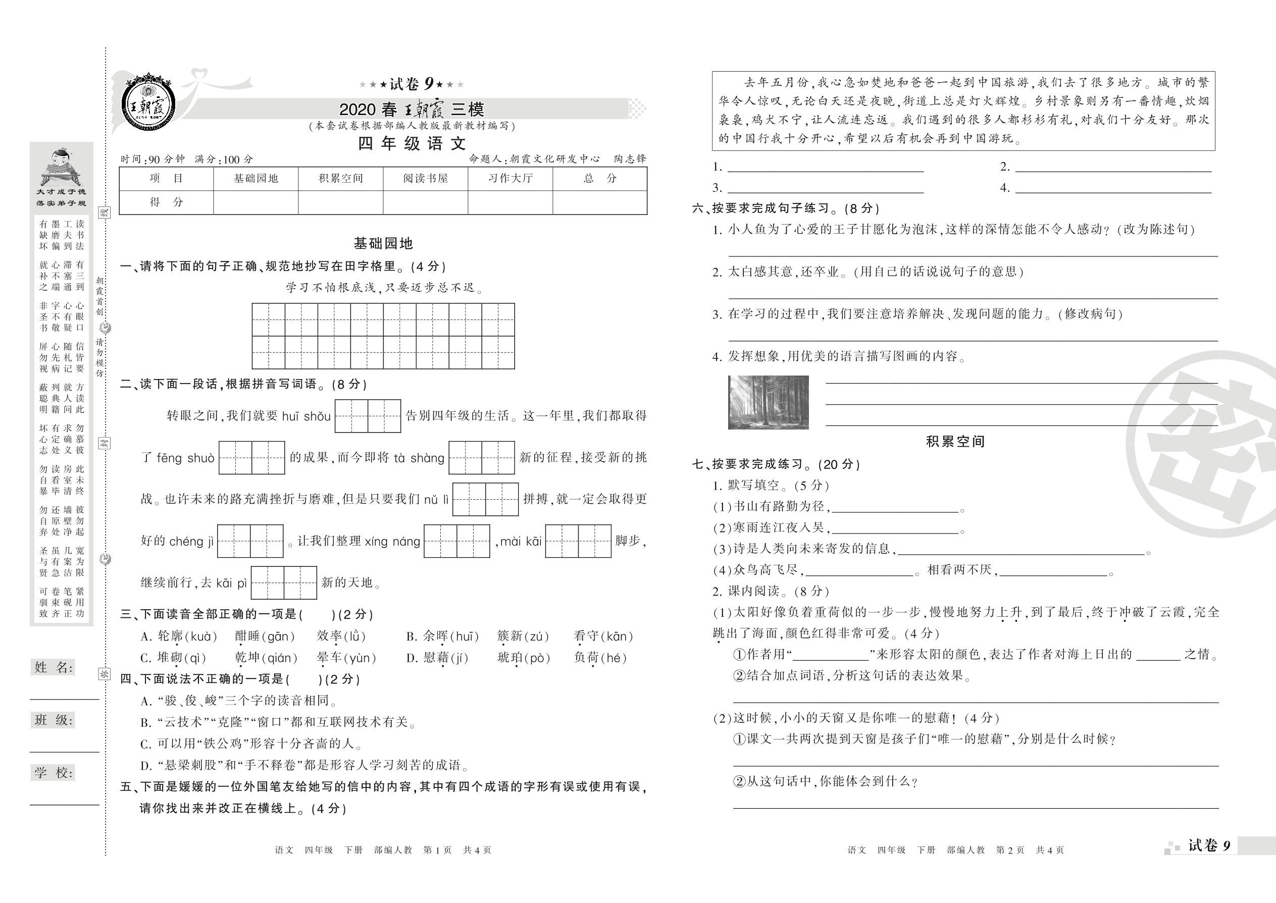 王朝霞期末模拟卷四年级下册语文(人教版)_R210801192003【9】
