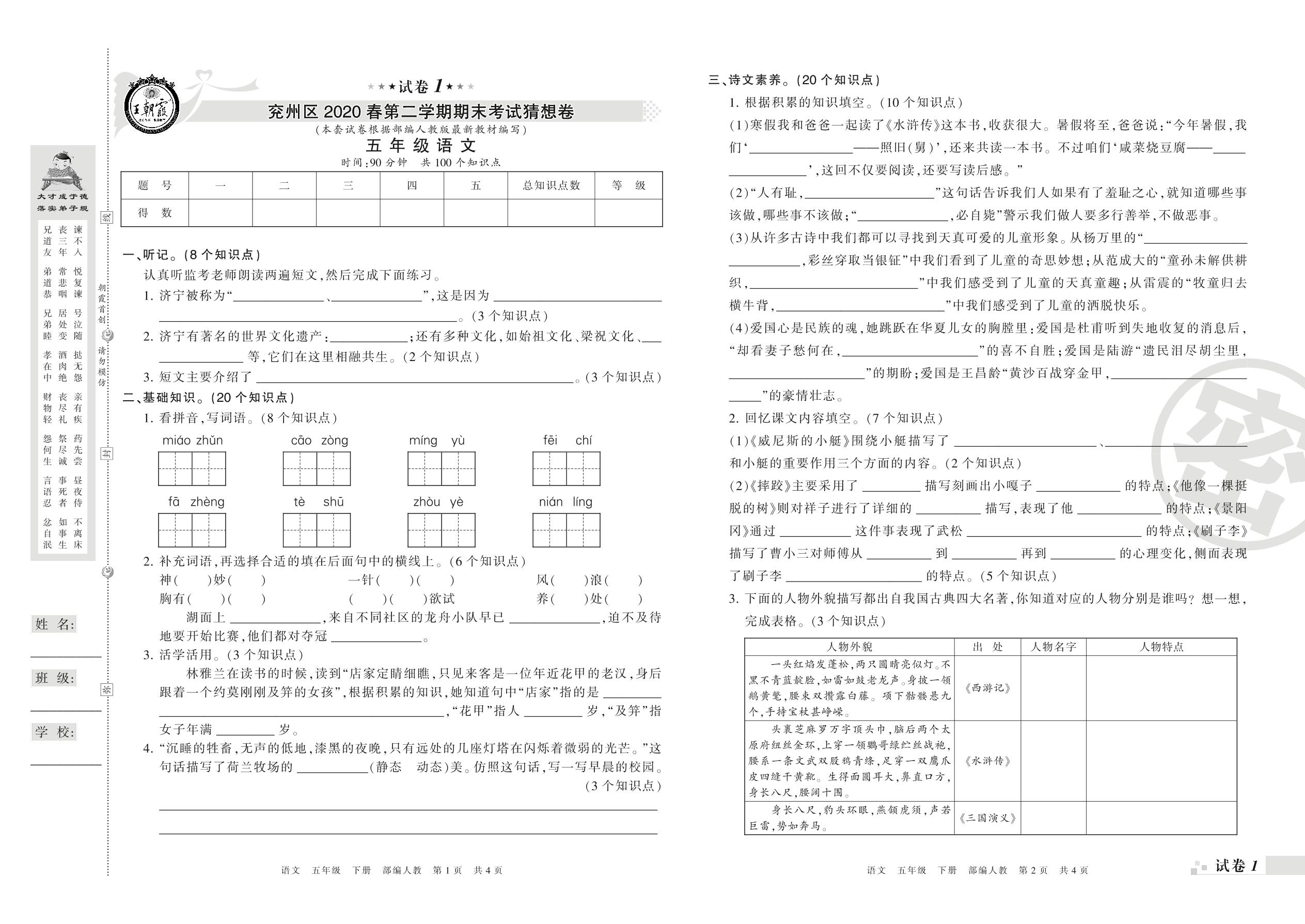 2018-2019学年第二学期济宁市兖州区猜想卷五年级语文试卷(人教版)【1】