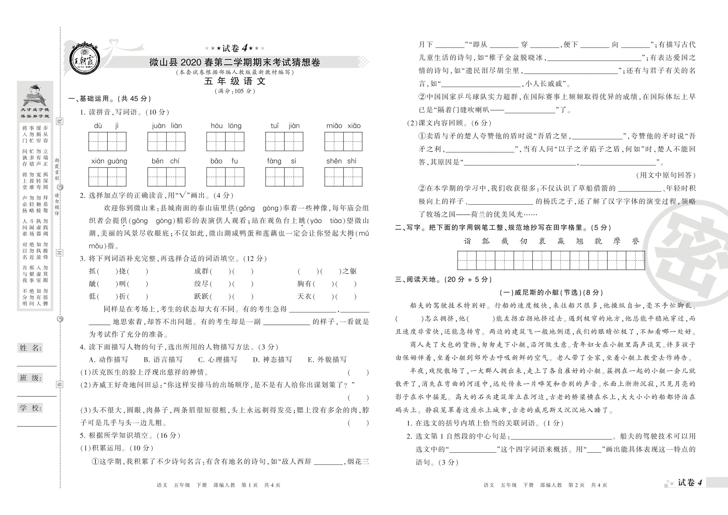 2018-2019学年第二学期济宁市微山县猜想卷五年级语文试卷(人教版)【4】