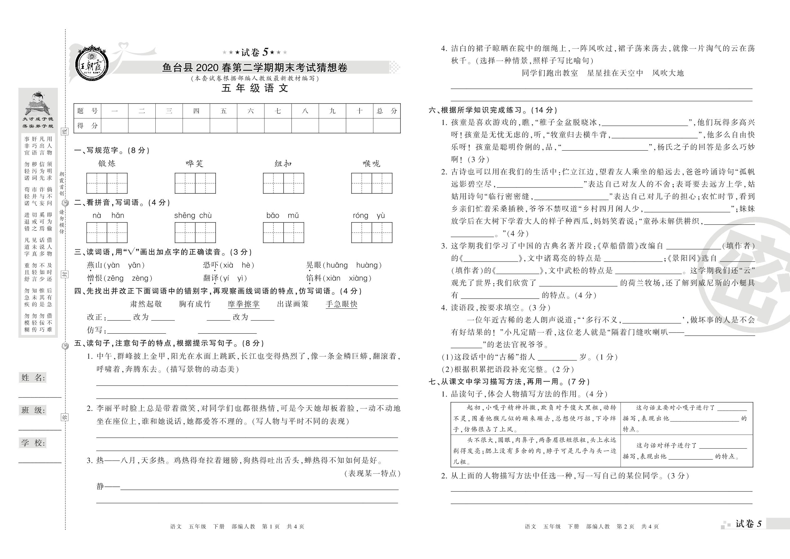 2018-2019学年第二学期济宁市鱼台县猜想卷五年级语文试卷(人教版)【5】