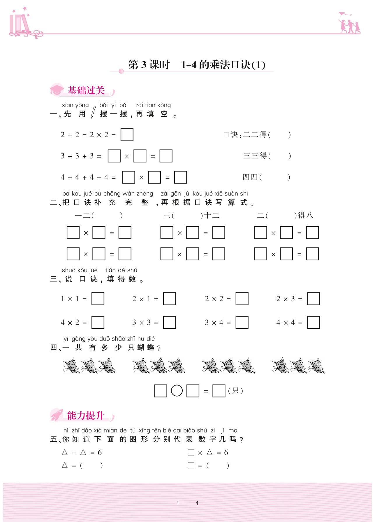 2020上册二年级数学苏教版 三 表内乘法(一)——第3课时 1~4的乘法口诀(1)