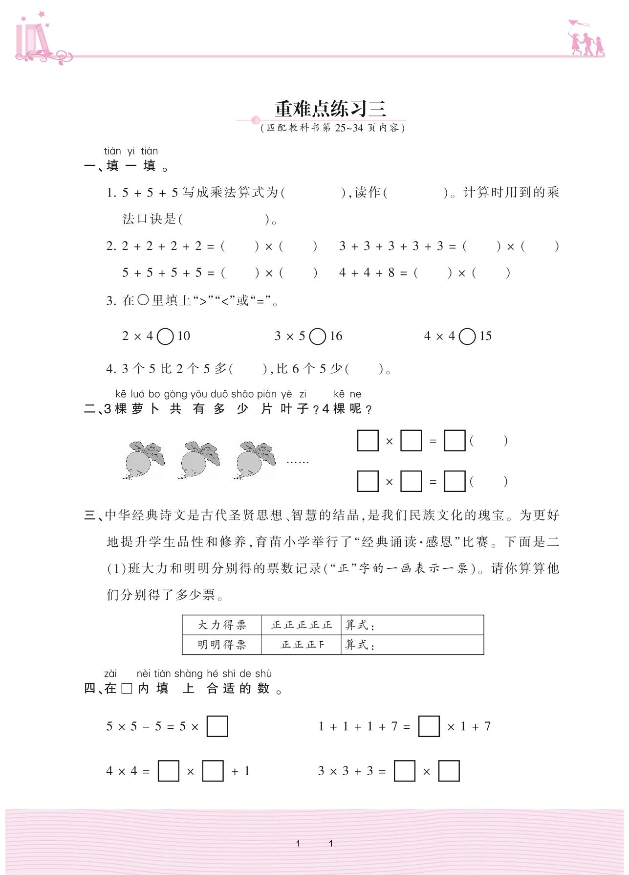 2020上册二年级数学苏教版 三 表内乘法(一)——重难点练习三