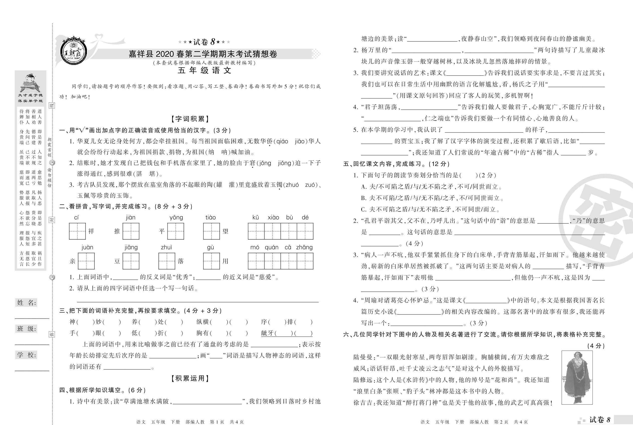 2018-2019学年第二学期济宁市嘉祥县猜想卷五年级语文试卷(人教版)【8】