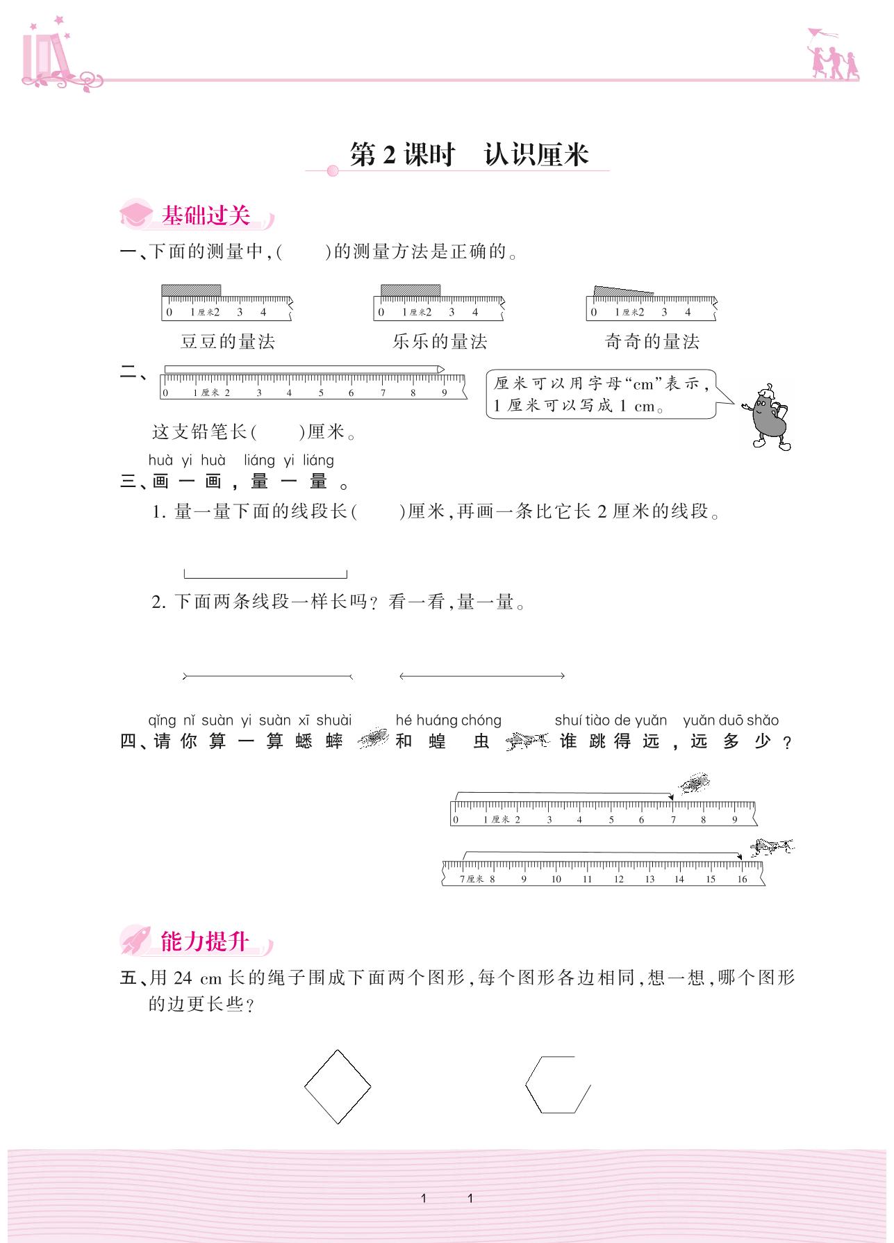 2020上册二年级数学苏教版 五 厘米和米——第2课时 认识厘米