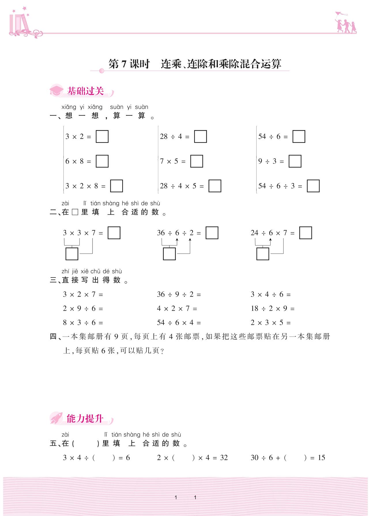 2020上册二年级数学苏教版 六 表内乘法和表内除法(二)——第7课时 连乘、连除和乘除混合运算