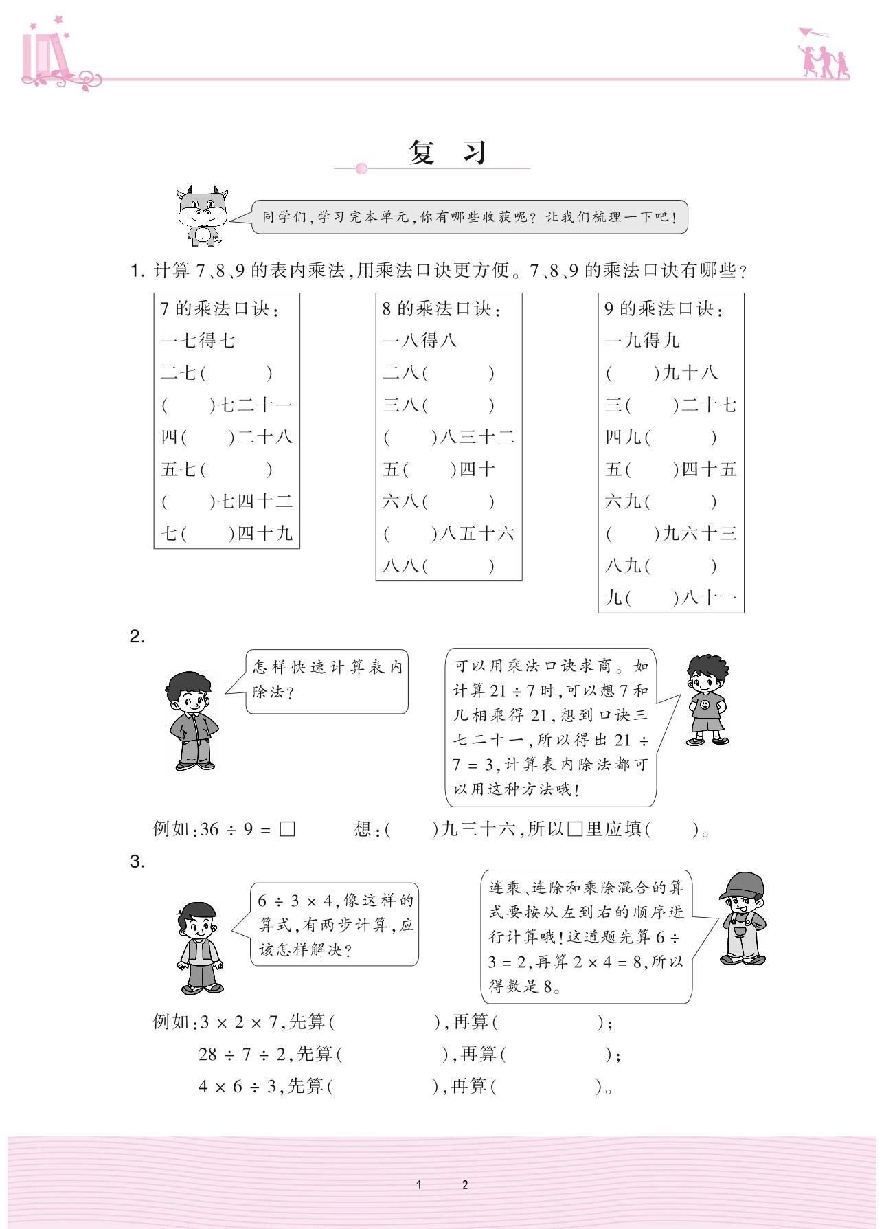 2020上册二年级数学苏教版 六 表内乘法和表内除法(二)——复习