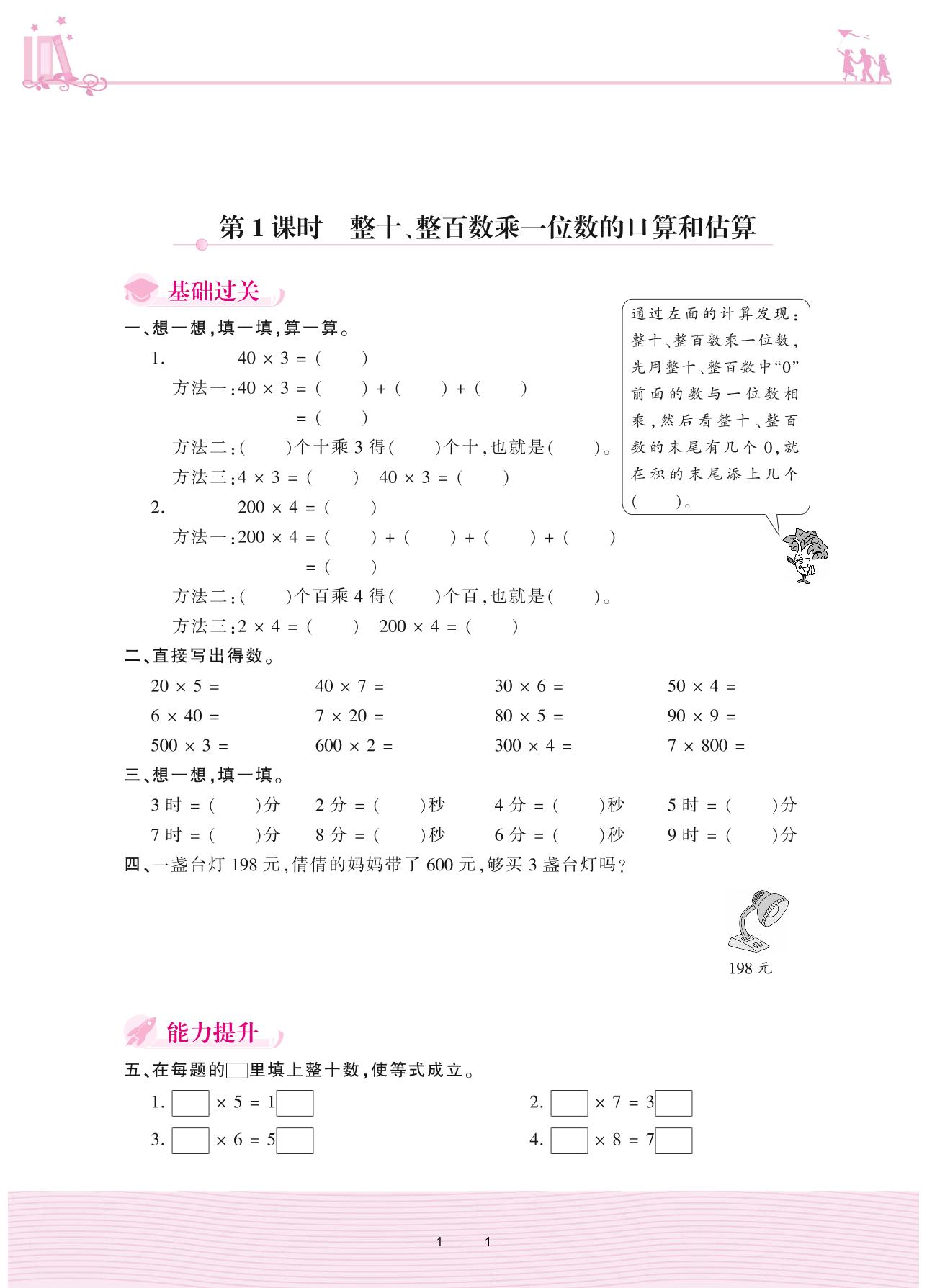2020上册三年级数学苏教版 一 两、三位数乘一位数——第1课时 整十、整百数乘一位数的口算和估算