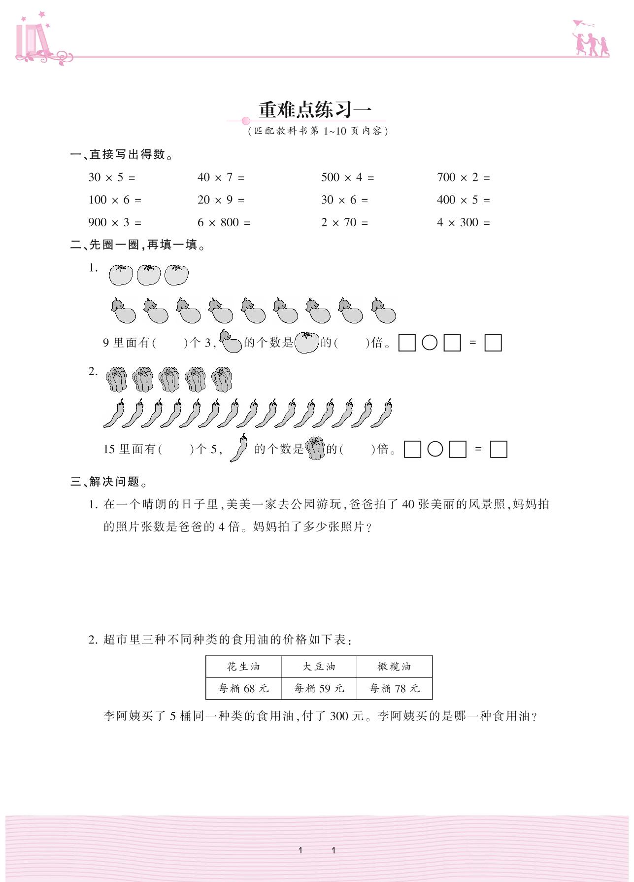 2020上册三年级数学苏教版 一 两、三位数乘一位数——重难点练习一
