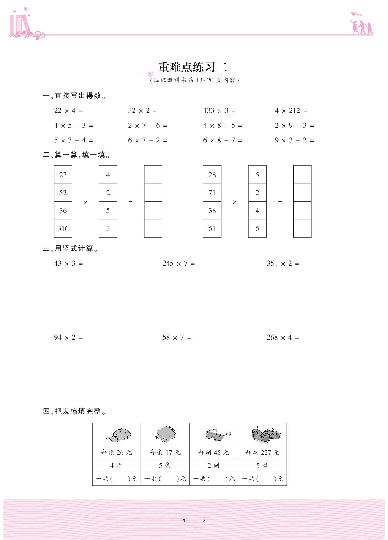 2020上册三年级数学苏教版 一 两、三位数乘一位数——重难点练习二