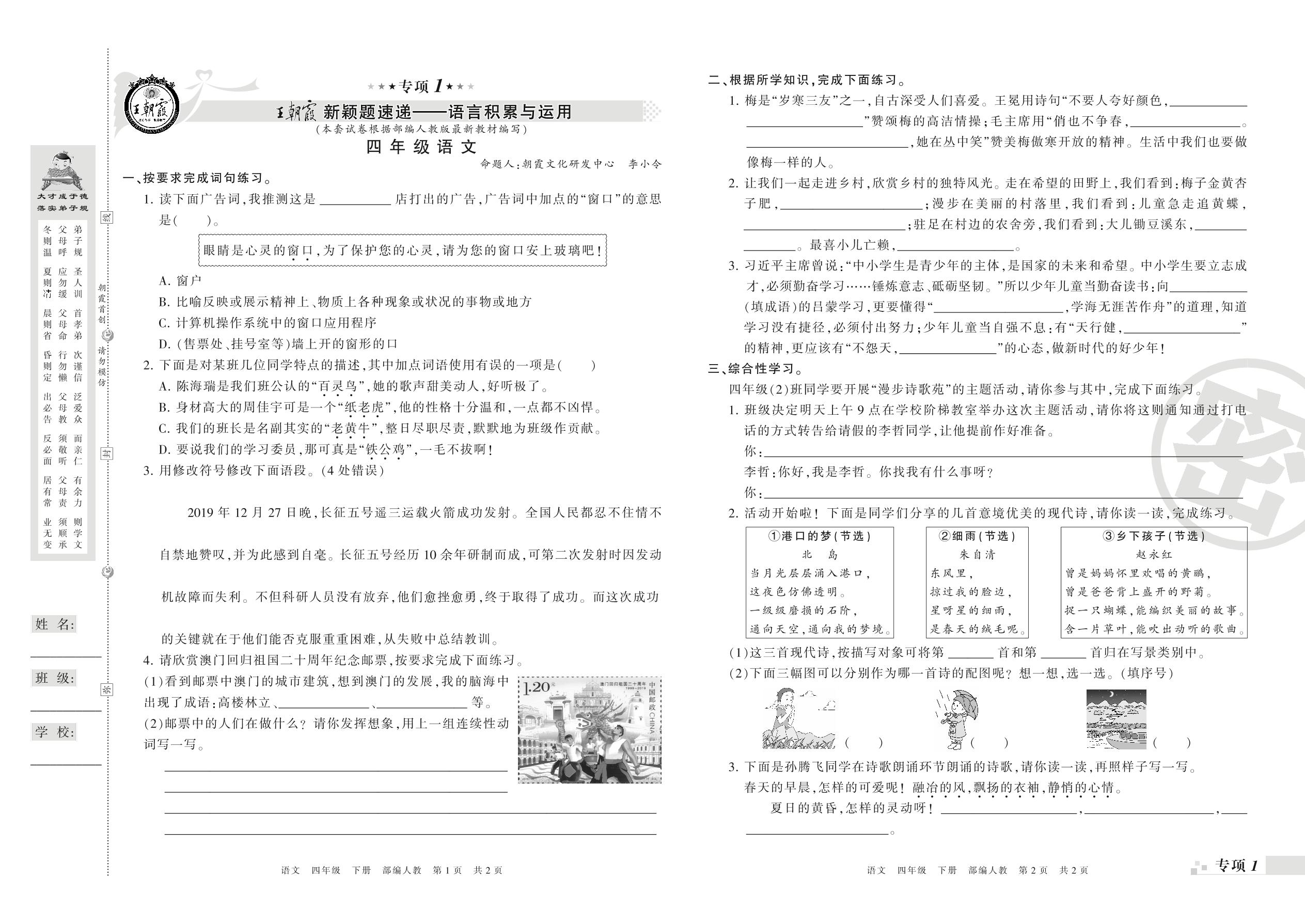 王朝霞期末专项卷——新颖题速递:语言积累与运用、非连续性文本阅读四年级下册语文(人教版)_R210801192207【0】
