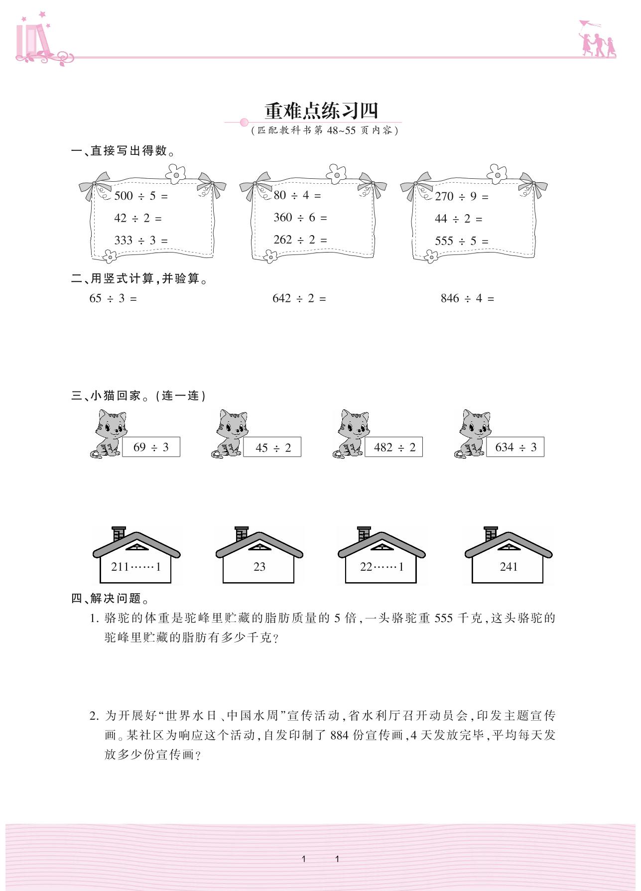 2020上册三年级数学苏教版 四 两、三位数除以一位数——重难点练习四