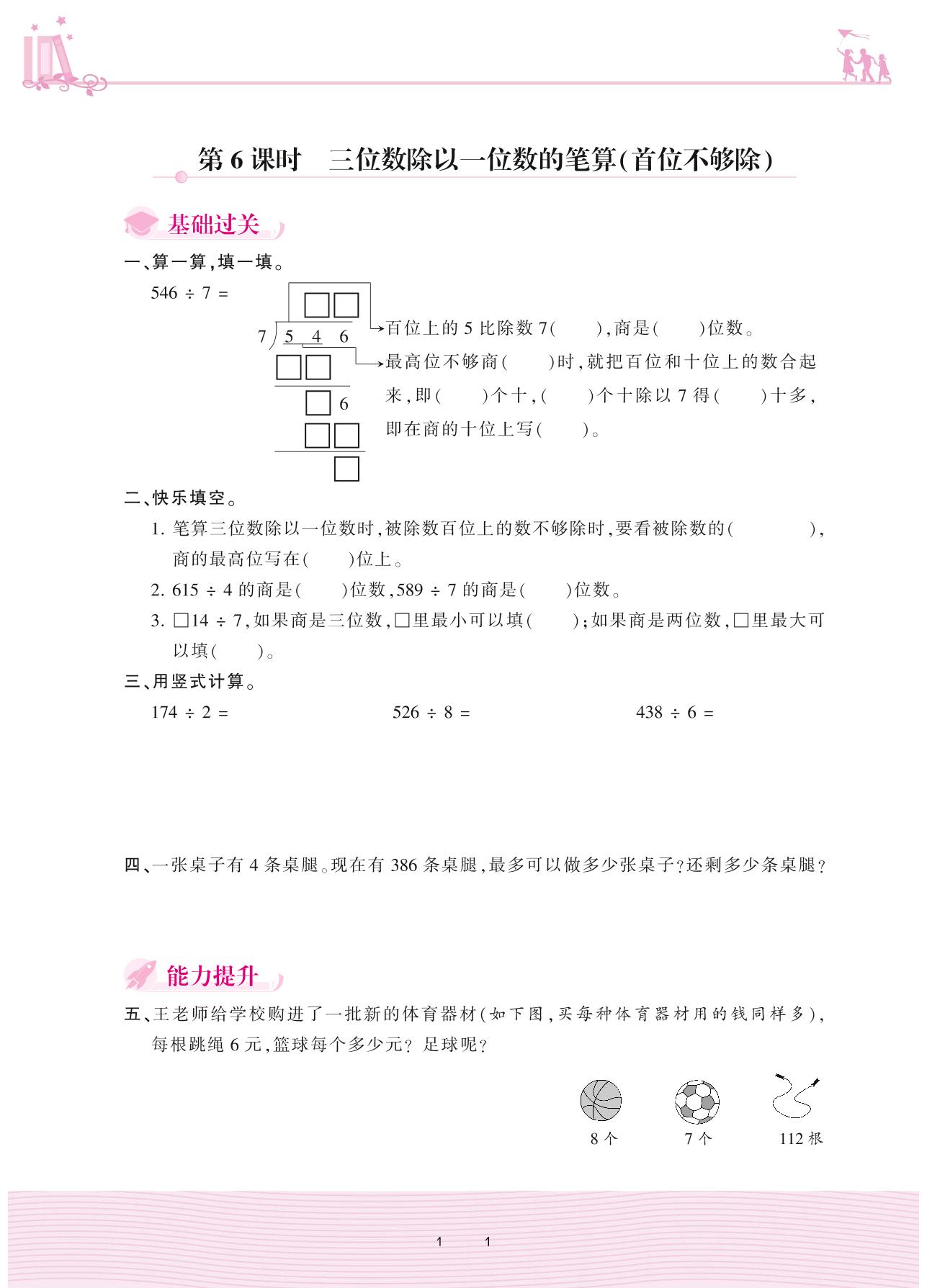 2020上册三年级数学苏教版 四 两、三位数除以一位数——第6课时 三位数除以一位数的笔算(首位不够除)