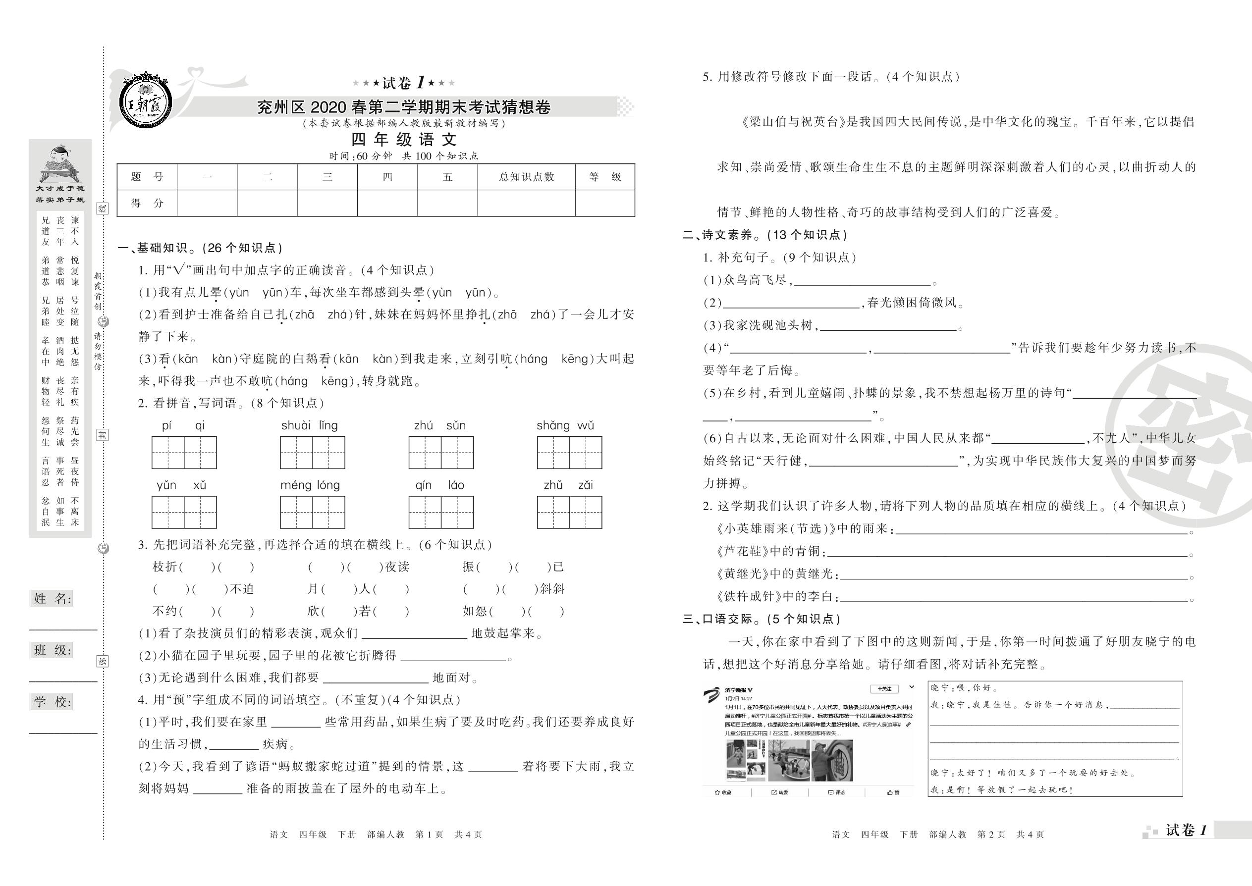 2018-2019学年第二学期济宁市兖州区猜想卷四年级语文试卷(人教版)【1】